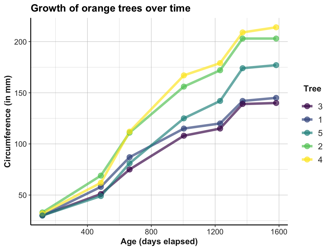 x = "Age (days elapsed)", y = "Circumference (in mm)") +