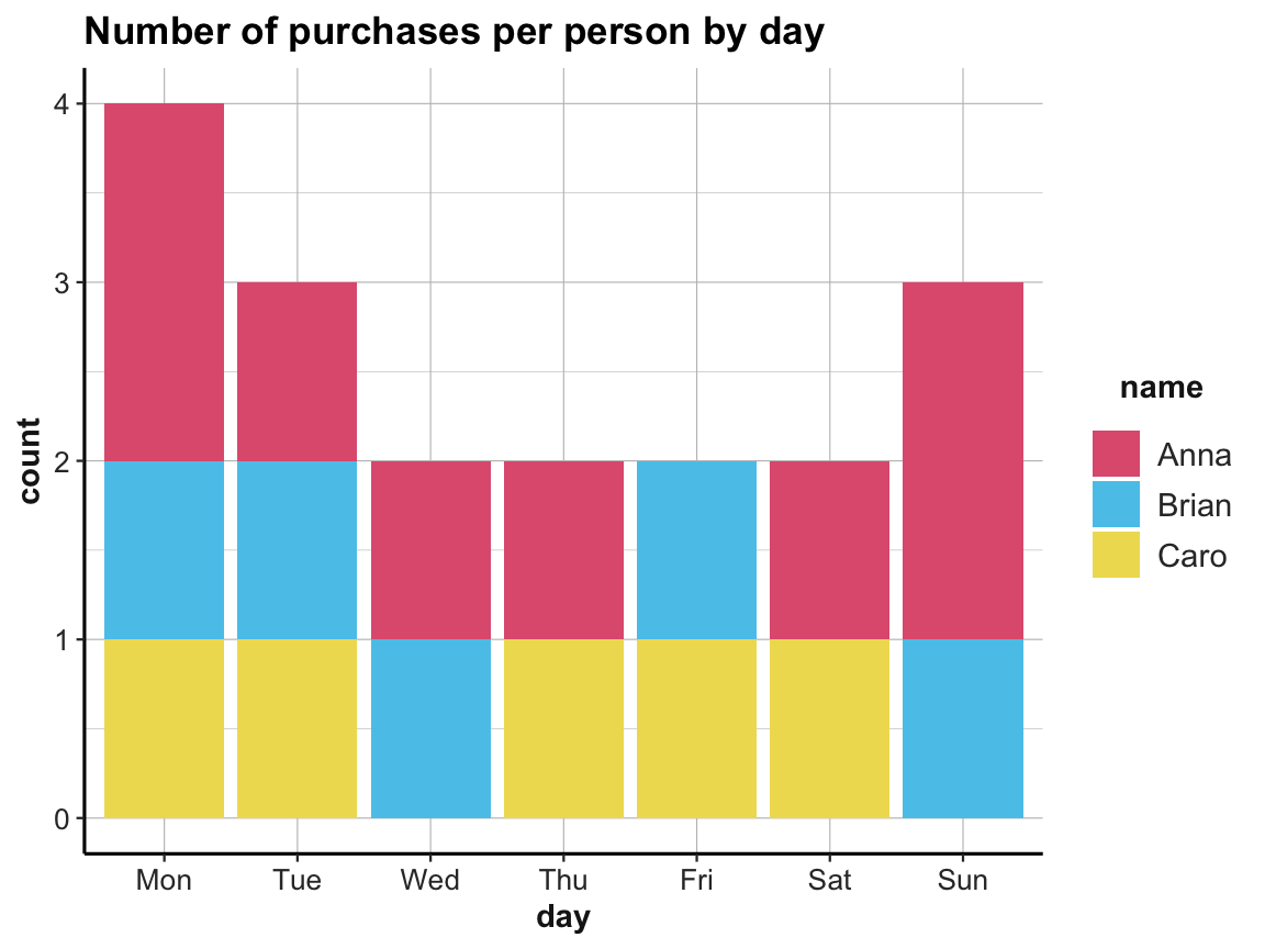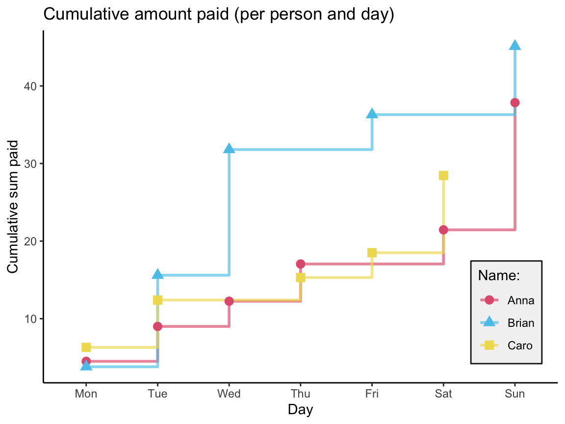Anna, Brian, and Caro are sharing a flat and keep a record of the items that each of them purchased for the household. At the end of each week, they use this data to balance their account. As an aspiring data scientist, you offer your help. Here’s last week’s data: