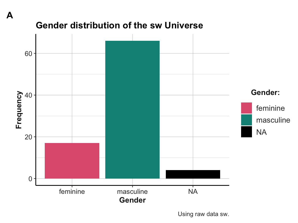#> 4 Twi'lek 2Bonus task: R typically provides many ways to obtain a solution. Let’s gain an overview of the gender distribution in our