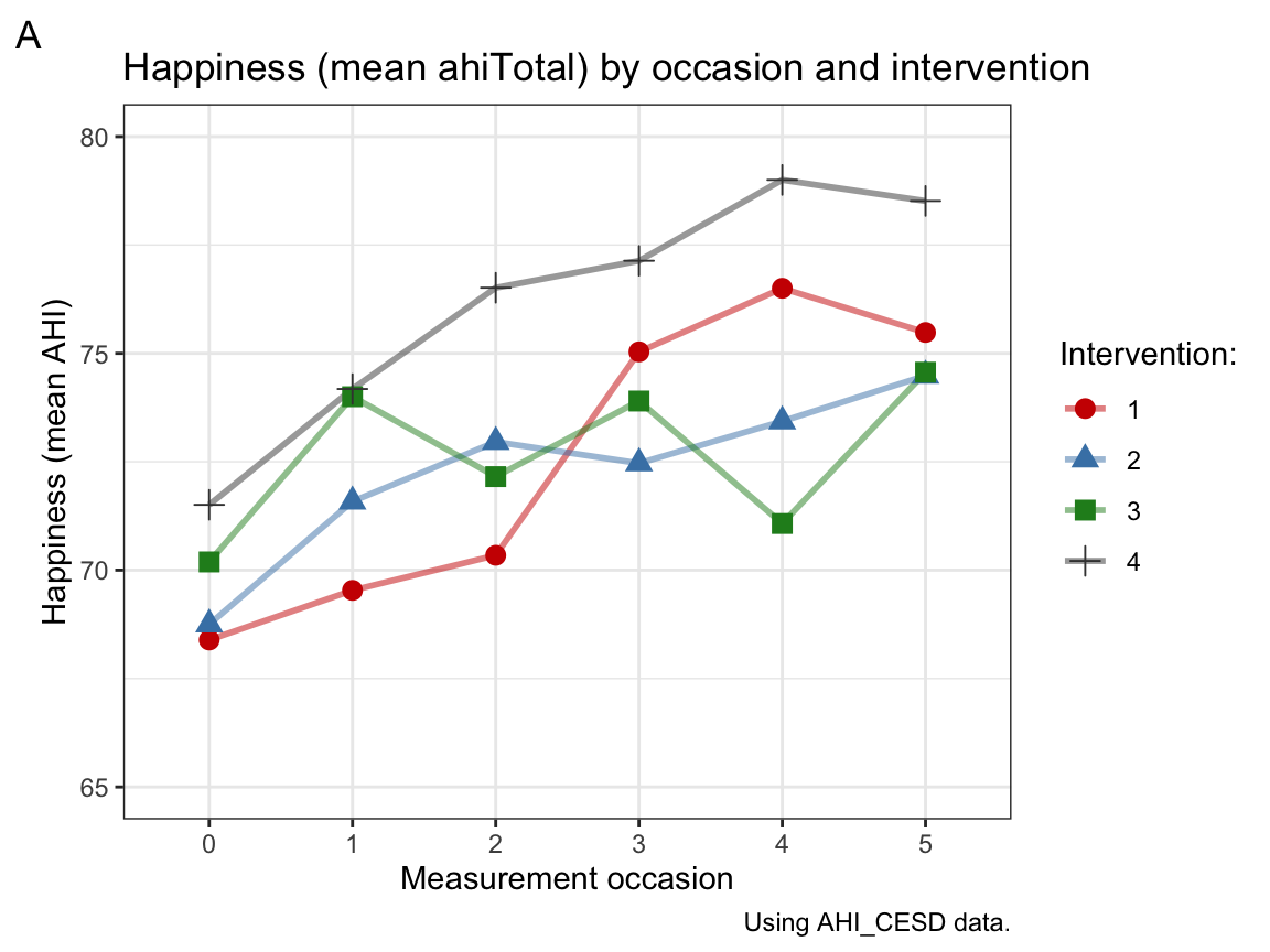 labs(tag = "A", title = "Happiness (mean ahiTotal) by occasion and intervention",