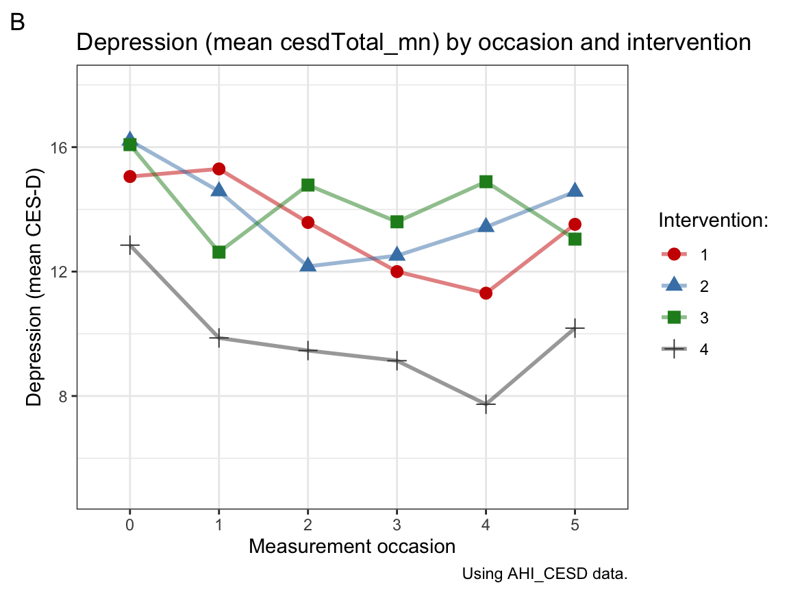 x = "Measurement occasion", y = "Depression (mean CES-D)",