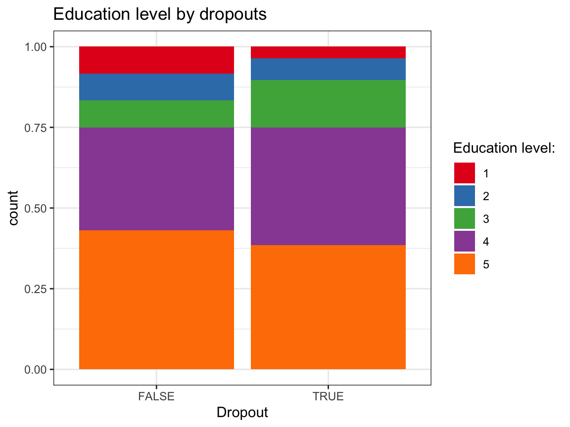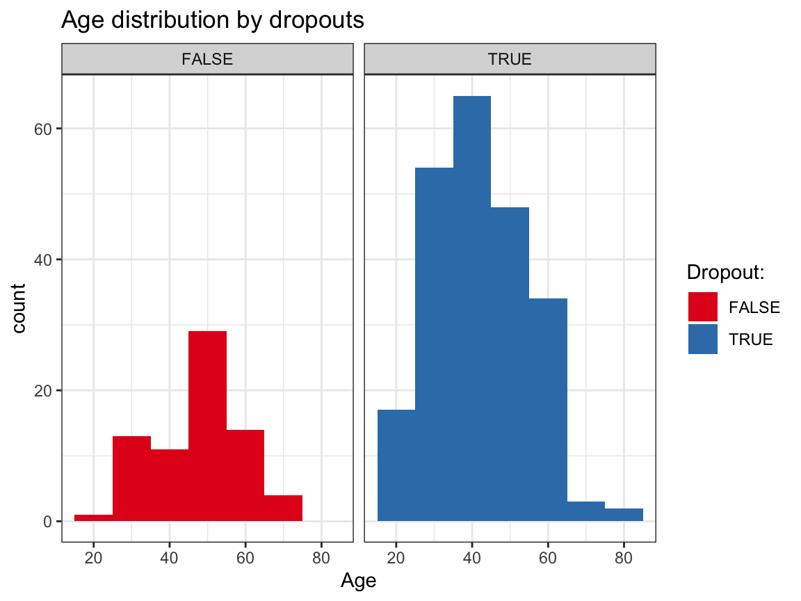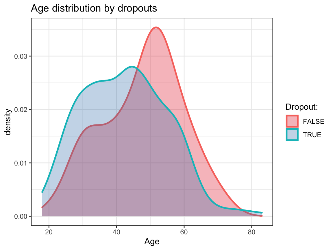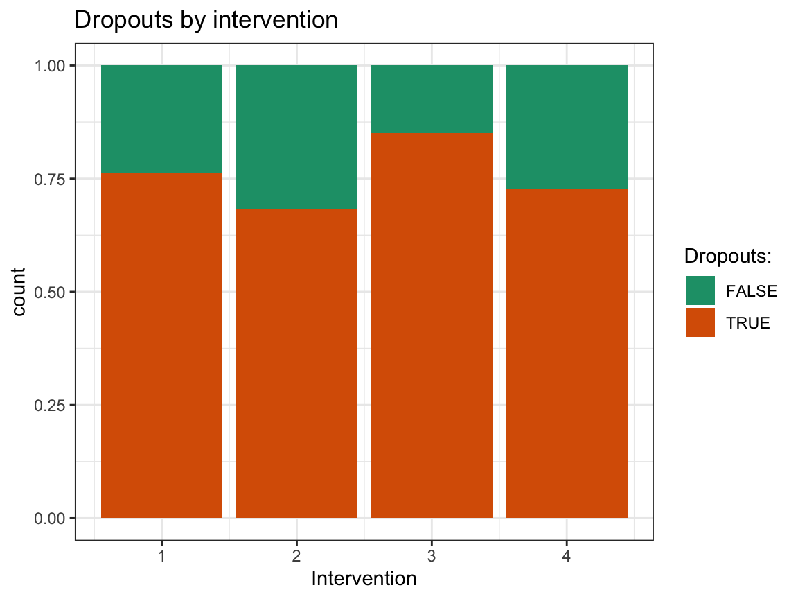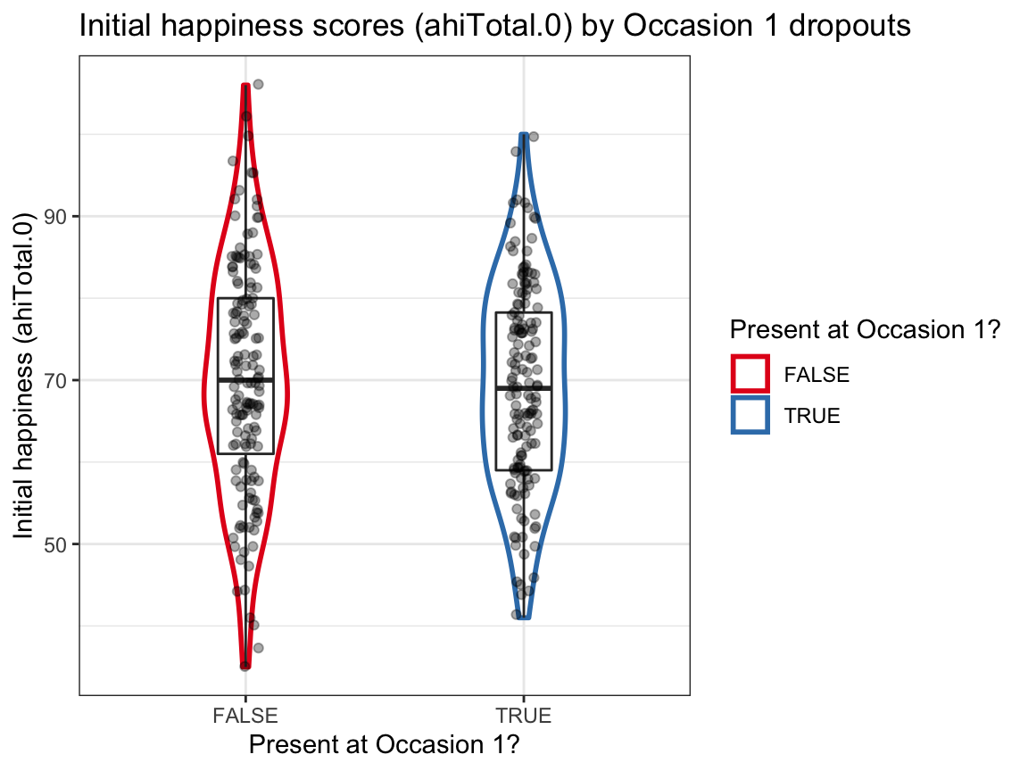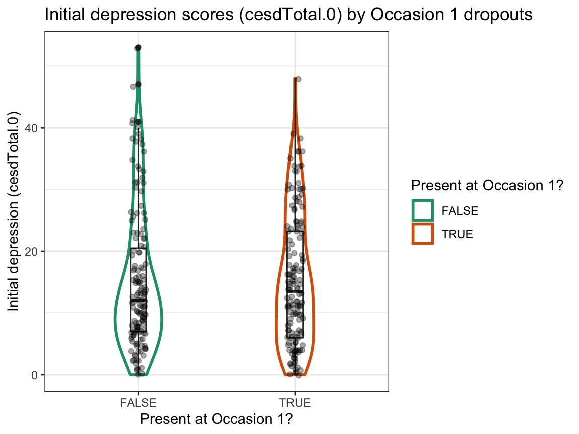 dropout(e.g., so thatdropoutisFALSEwhen a person was measured on all occasions andTRUEwhen a person missed one or more occasions), and add this variable to the data.