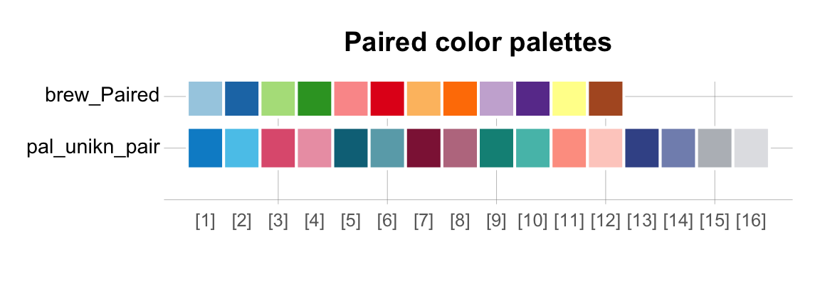 - Paired color palettes combine a qualitative color palette with some sequential elements: