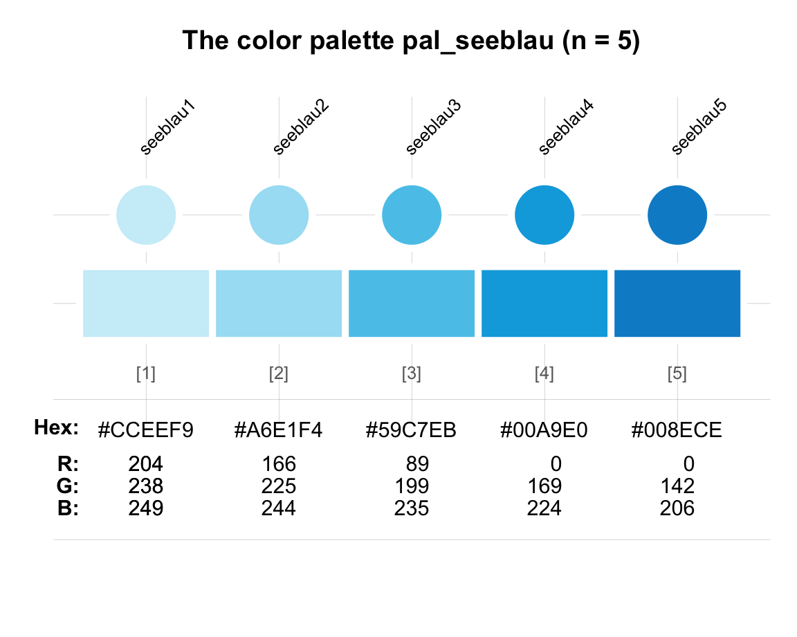 As it can be difficult to distinguish between the different shades of a color, the HEX and RGB codes assure us that the color named “seeblau3” in pal_seeblau is identical to Seeblau from above.