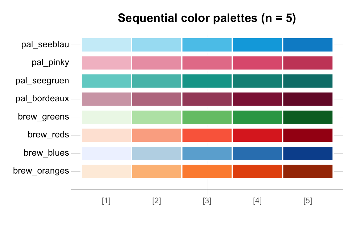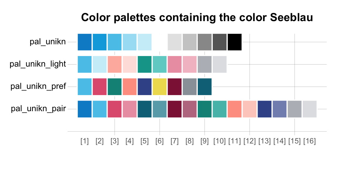 For instance, the color Seeblau occurs not only in isolation, but also as the 3rd element of the color palette pal_seeblau, which contains five different intensities of a color with very similar hue (or tint):