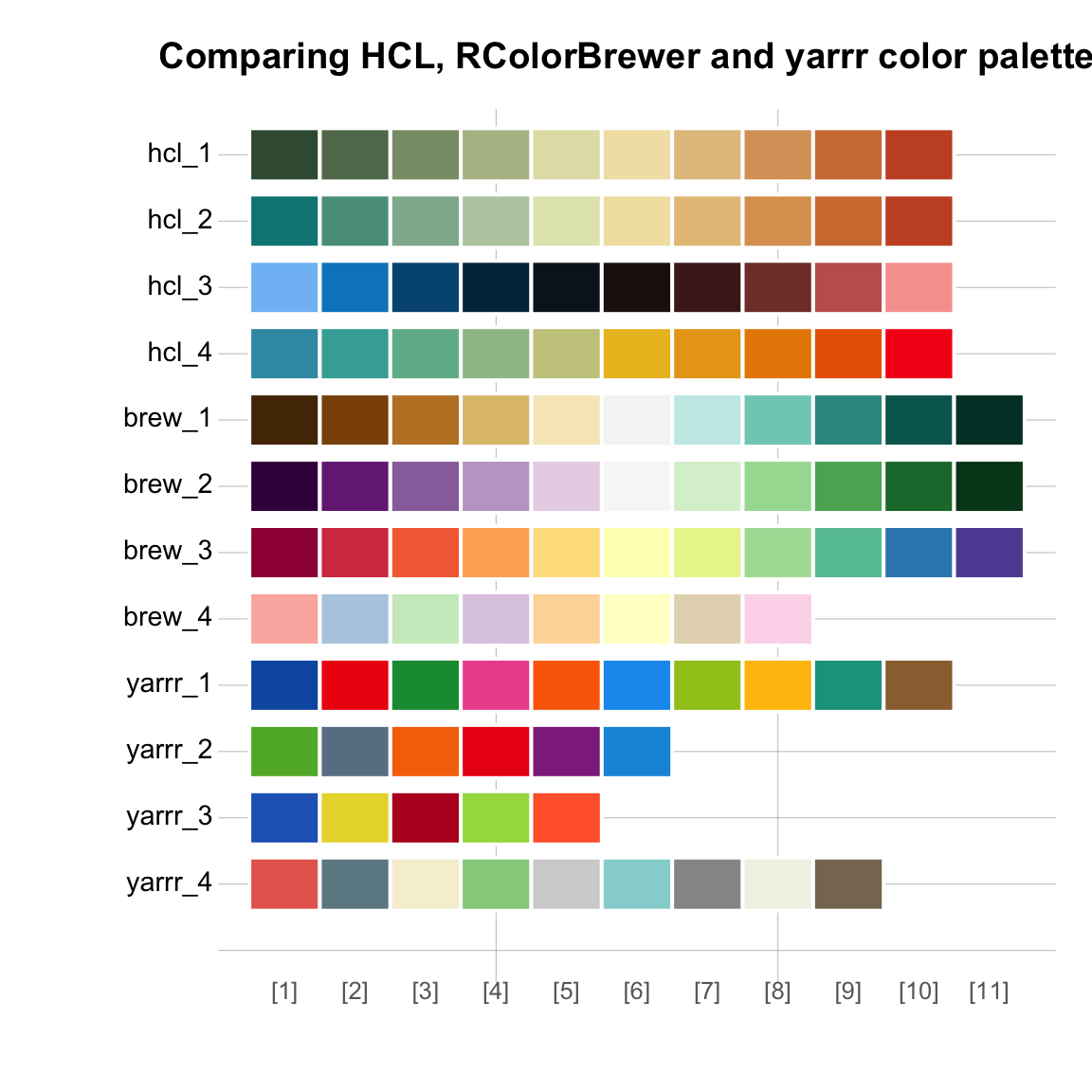 main = "Comparing HCL, RColorBrewer and yarrr color palettes",