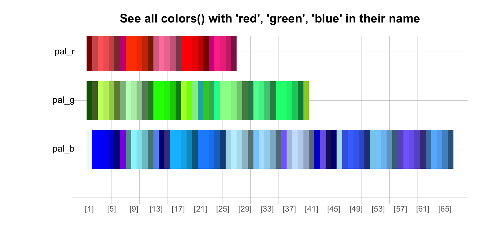 By default, grepal(pattern, x) searches x = colors() (i.e., the 657 named colors provided by the grDevices package), but x can be set to other named color palettes (including data frames). As pattern can be a regular expression (see Appendix E now provides a primer on using regular expressions), we can easily answer more complex questions: