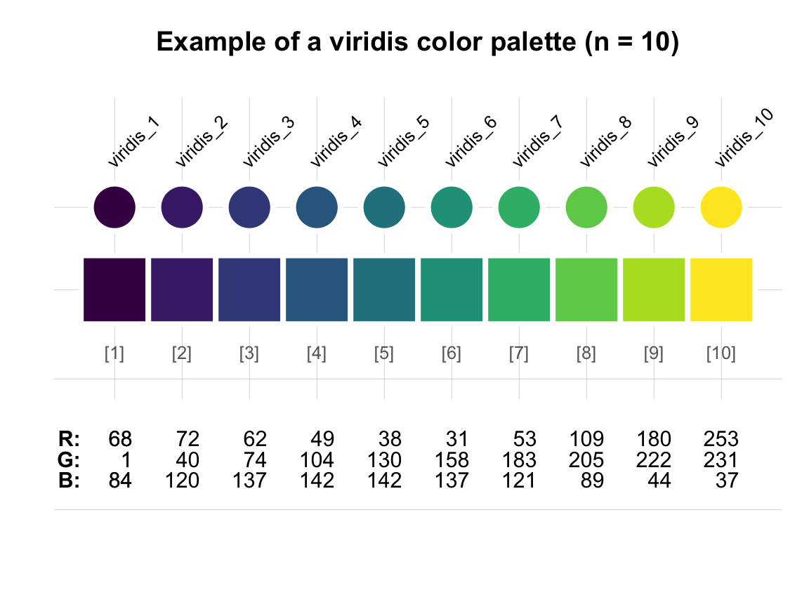 The color scales of the viridis package (Garnier, 2024) were specifically designed to be perceptually-uniform, both in regular form and when converted to black-and-white.