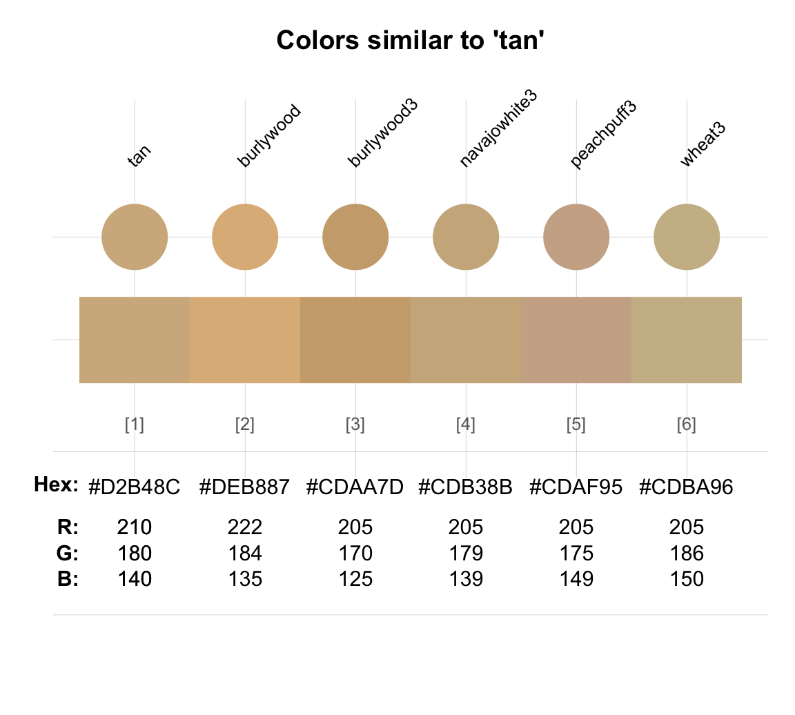 #> "tan" "burlywood" "burlywood3" "navajowhite3" "peachpuff3"