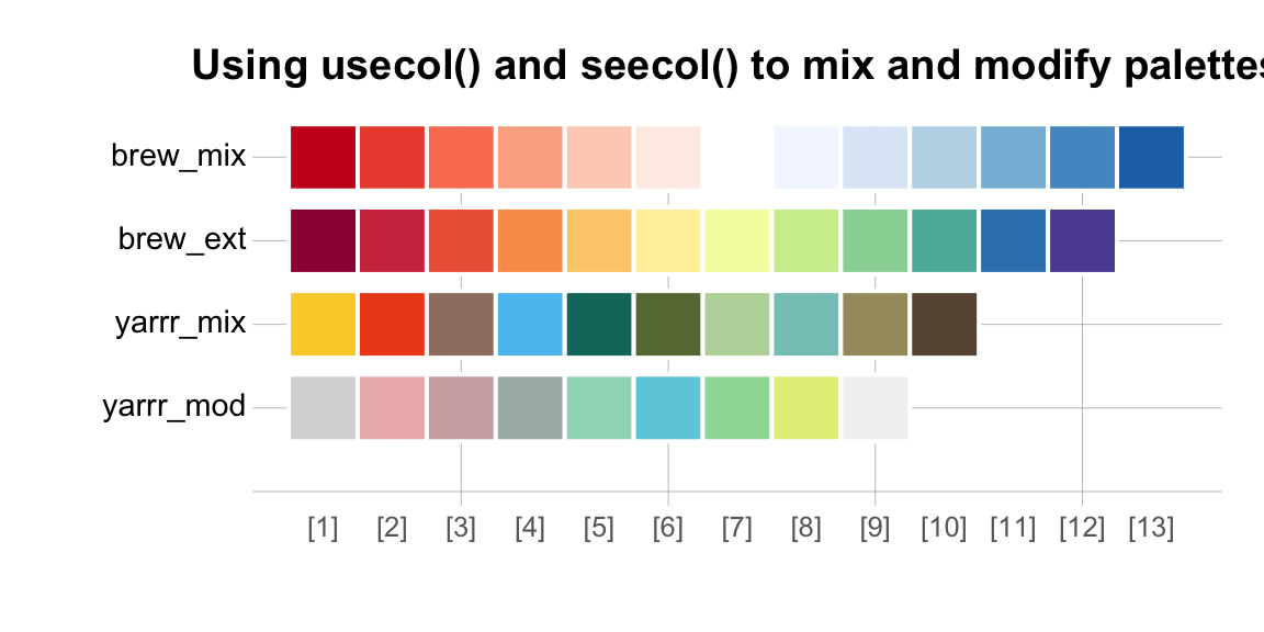 Similarly, we can use the usecol() function to mix and modify color palettes from various sources.