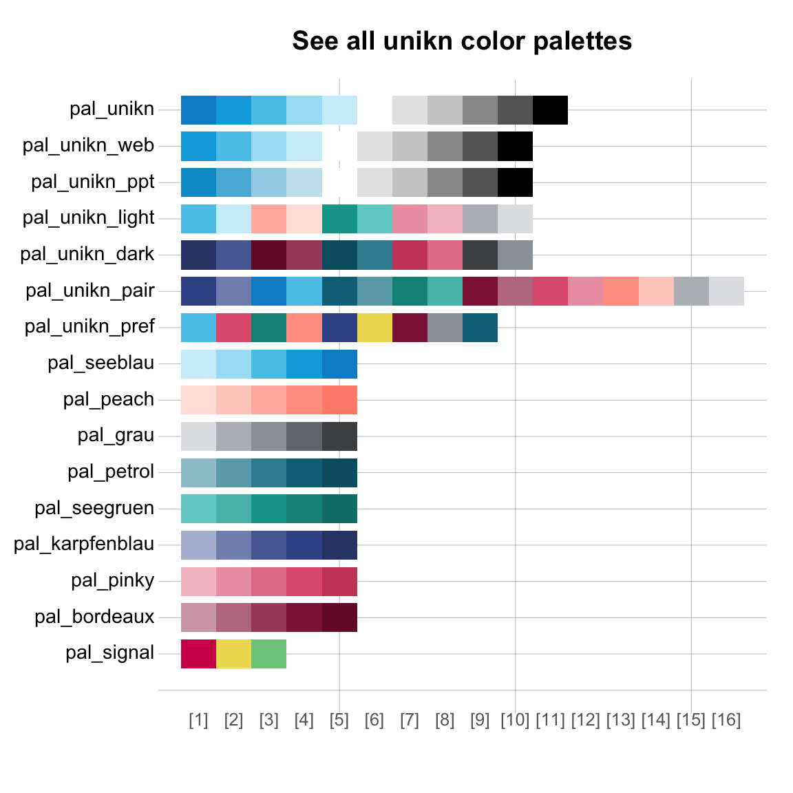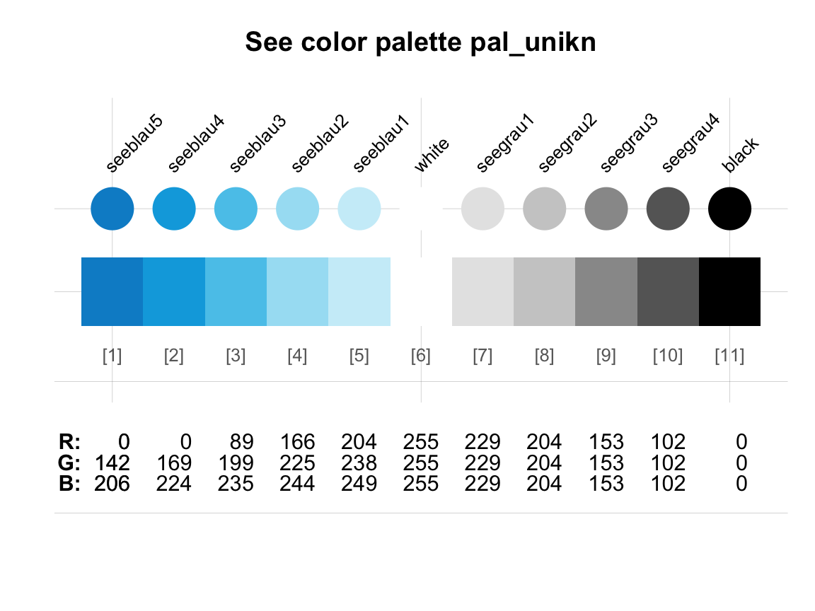 The unikn package (Neth & Gradwohl, 2024) implements the color palettes of the University of Konstanz and is used throughout this book. Additionally, the unicol package (Neth et al., 2025) provides the color palettes of many other universities and educational or research institutions.