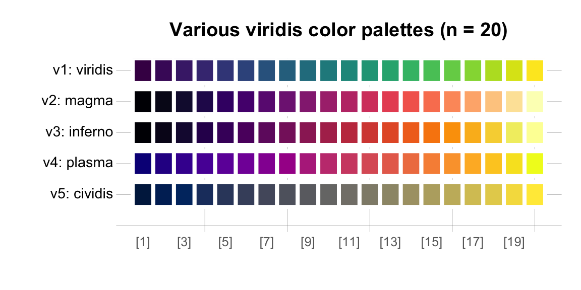 pal_names = c("v1: viridis", "v2: magma", "v3: inferno", "v4: plasma", "v5: cividis"))