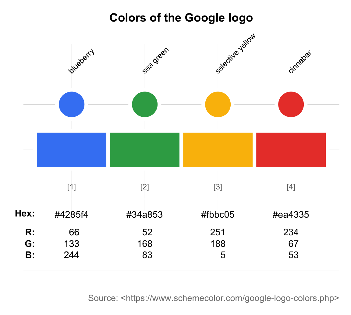 - look up their color definitions (e.g., at https://en.wikipedia.org/ or https://www.schemecolor.com);
