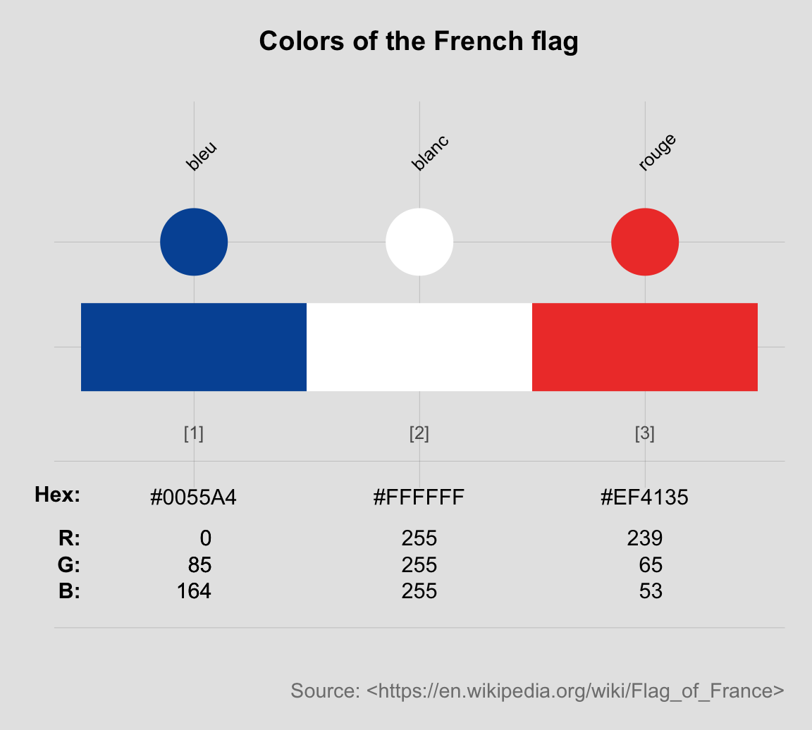 Beware: Please note that looking up colors can be a sensitive and controversial act, and we should always be careful in choosing and crediting our sources. For instance, Wikipedia notes at least three different definitions for the blue and red colors of the U.S. flag. Similarly, the specifications of the Tricolore colors at Wikipedia and Schemecolor.com agree in their HEX codes, but the latter states that the blue color of the French flag is called “USAFA blue”. I wonder whether French readers would agree? (Lots of material for conspiracy theories here…)