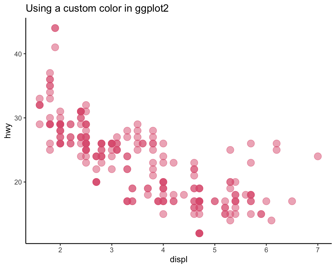 my_colorsin aggplot()command, we need to add thescale_color_manual()function that instructs ggplot to use a custom color scale for the current plot. Note thatscale_color_manual()expects to receive colorvalues, rather than mere color names, and a vector, rather than a data frame: