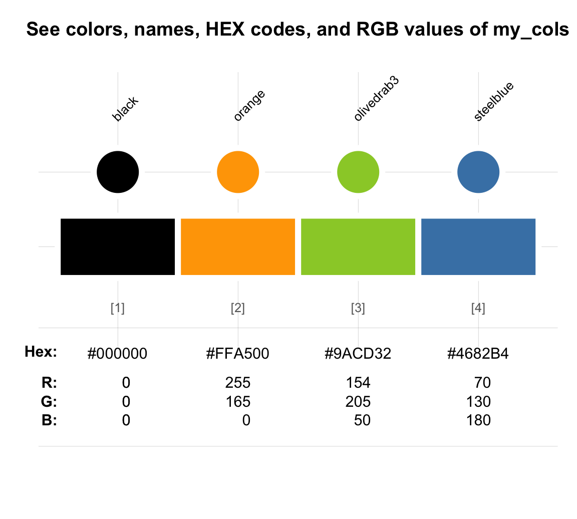 rgb( 70, 130, 180, maxColorValue = 255)) # RGB values Note that both color names and HEX codes were entered within quotation marks (i.e., yield vectors of type character).