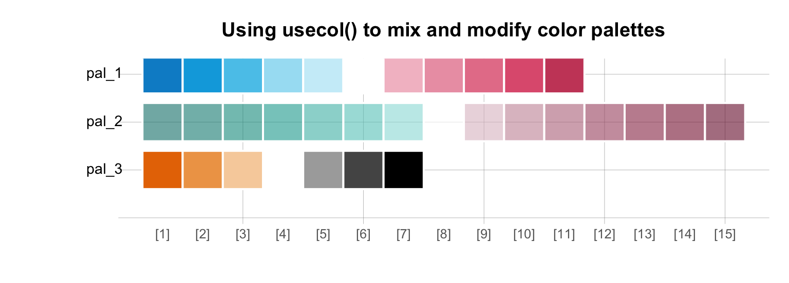 The usecol() function also allows mixing combinations of colors and color palettes, squeezing or stretching them to arbitrary lengths, and setting their transparency: