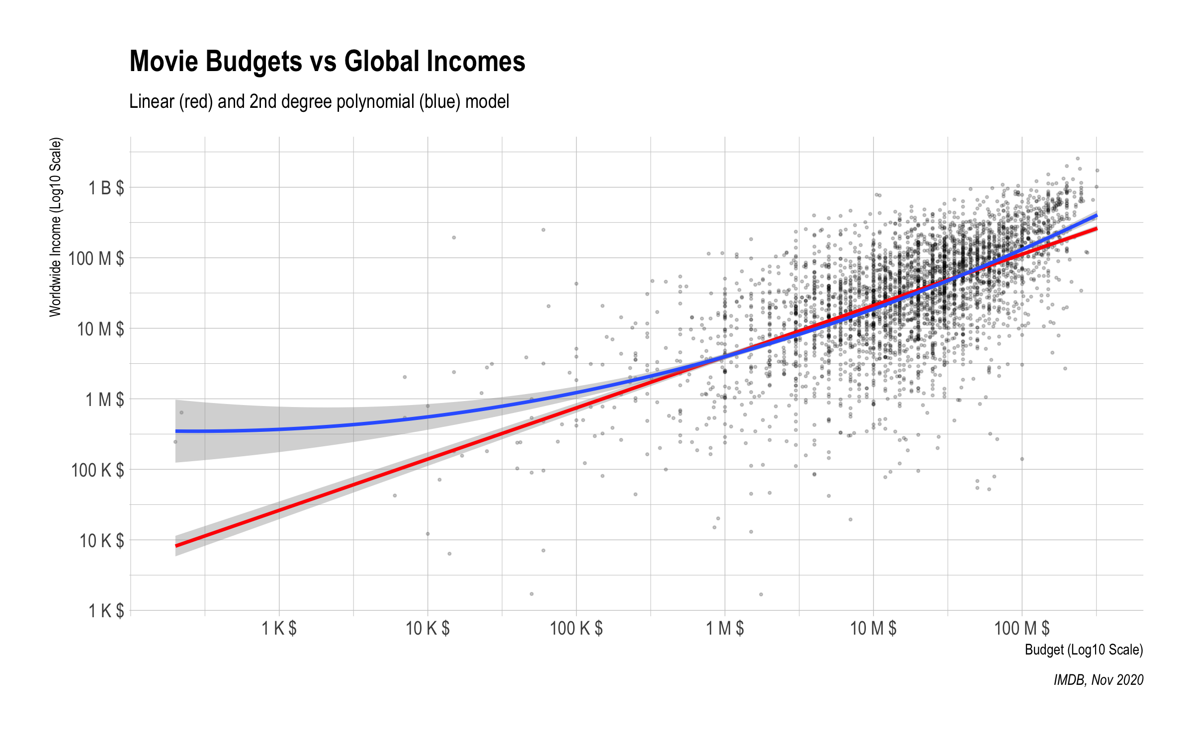 During the exploratory data analysis, the clear correlation between budget and income was observed. For modelling of that relation 4 different models were used and compared to their adj.r.squared value. As expected, the linear model was best when both budget and income was at logarithmic scale.