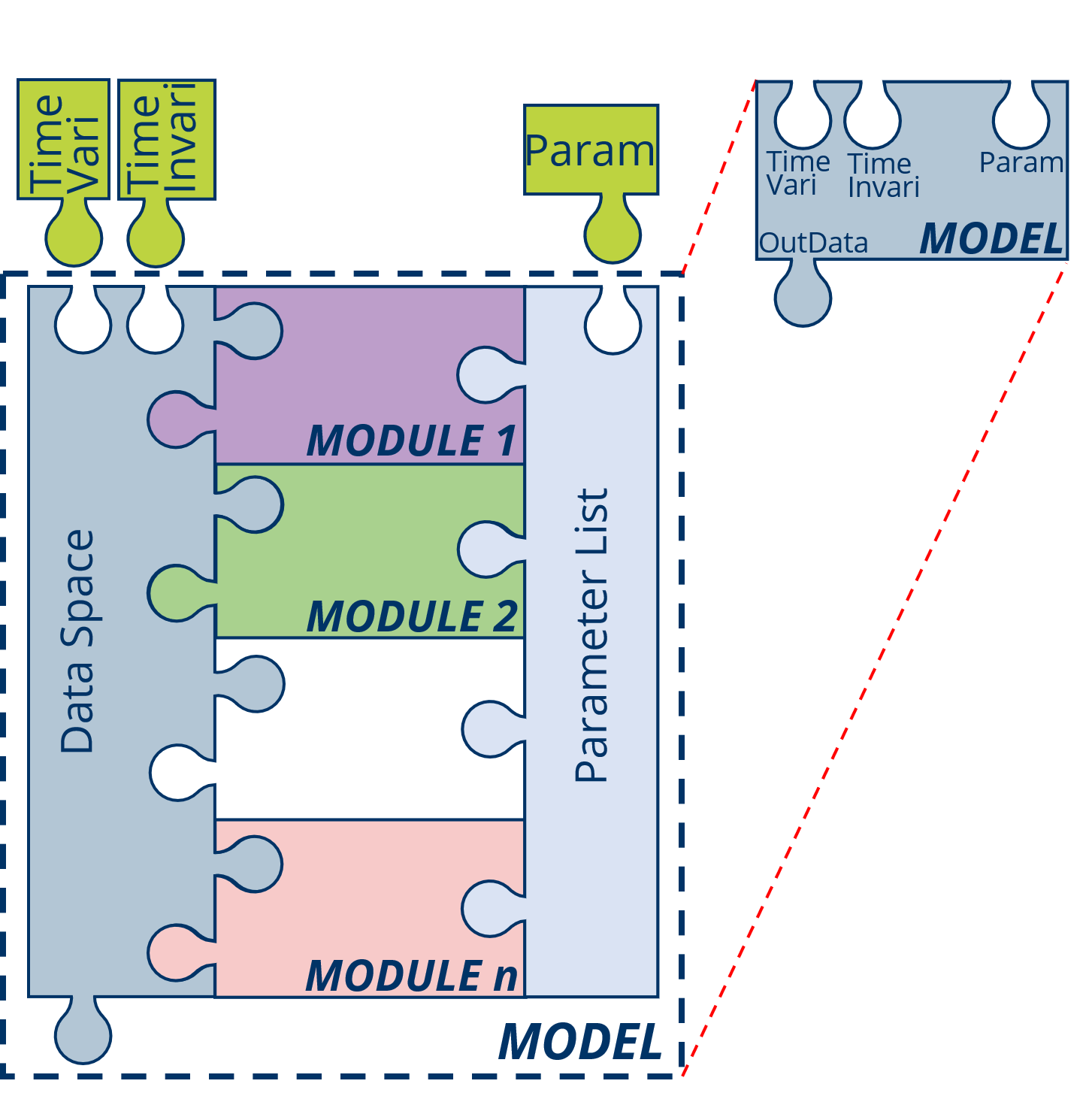 The arguments of MODULE and MODEL are fest in the form “InData, Param, …” for MODULE and “TimeVariData, TimeInvariData, Param, …” for MODEL, so for the data transfer it’s very important to set the same structure as “Data_” dataset.