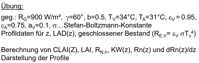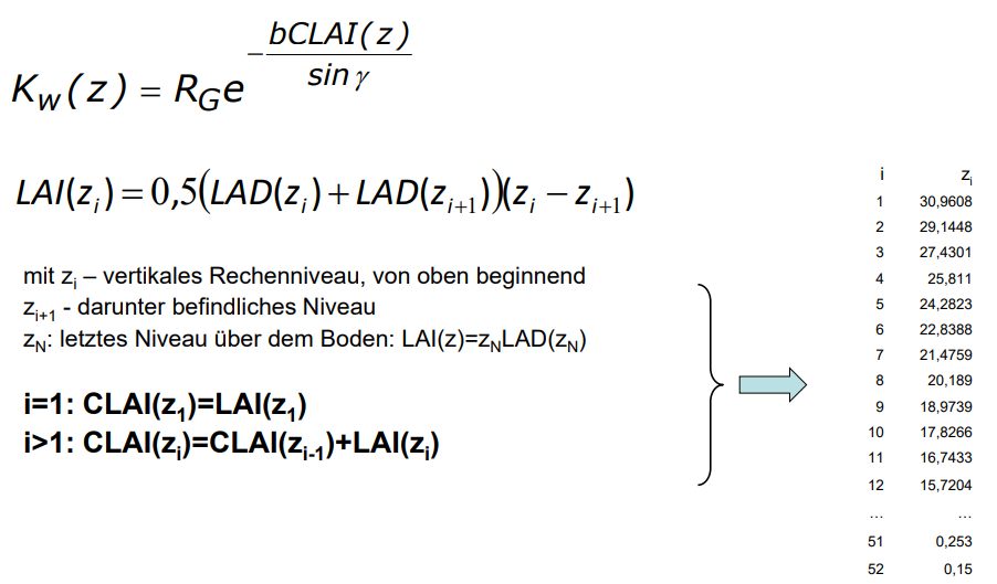 \(K_{w,0}\): kurzwellige Einstrahlung am Erdboden im Bestand, \(R_G\): Globalstrahlung über dem Bestand, \(b\): Extinktionskoeffizient (b=0.5) für zufällige Blattverteilung, \(LAI\): Blattflächenindex, \(\gamma\): Sonnenwinkel.