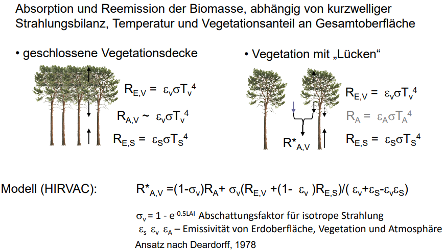 \(\sigma_V=1-e^{0.5LAI}\) Abschttungsfaktor für isotrope Strahlung, \(\epsilon_S\), \(\epsilon_V\), \(\epsilon_A\): Emissivität von Erdoberfläche, Vegetation und Atmosphäre.