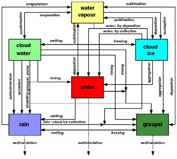Conversion processes, likesnow to graupel conversion by riming, are very difficult to parameterize but very important in convective clouds. Particle density and fall speeds are important parameters.