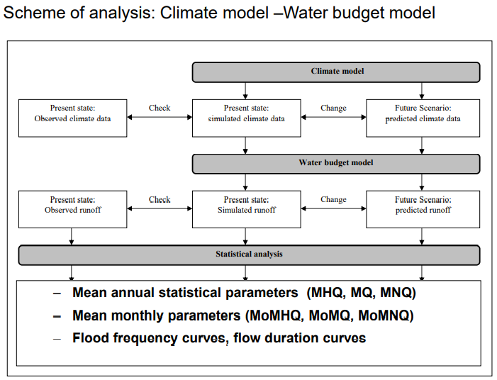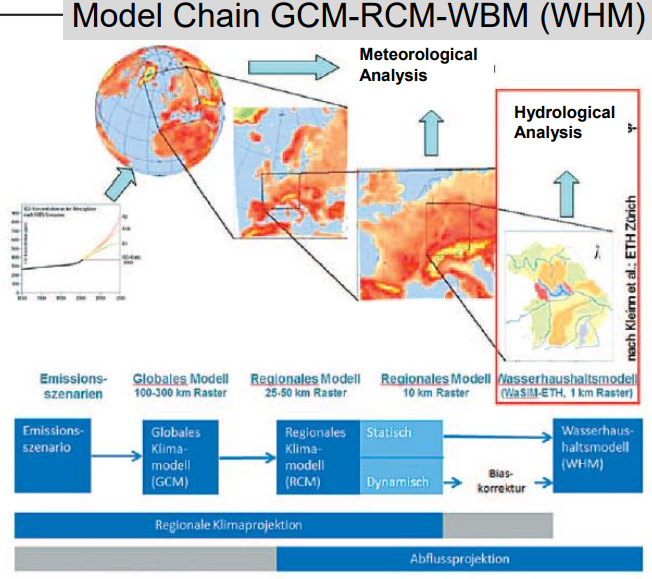 Emissionsszenario \(\rightarrow\) Globales Klimamodell (GCM) \(\rightarrow\) Regionales Klimamodell (RCM) \(\rightarrow\) Wasserhaushaltmodell (WHM)