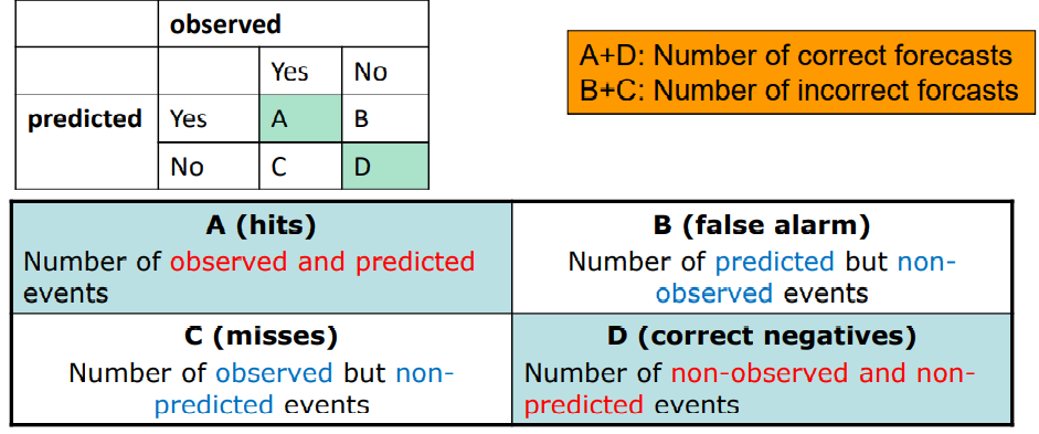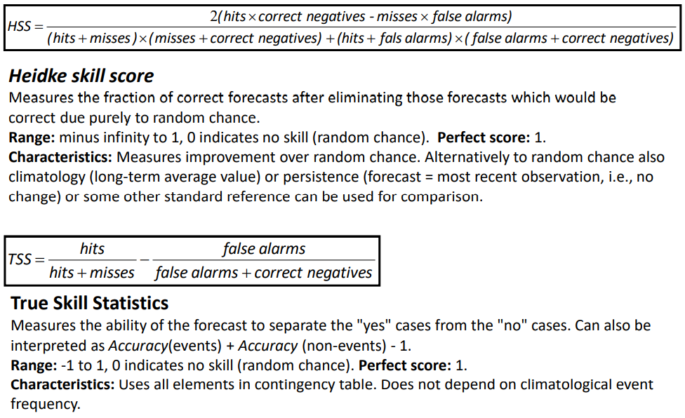 Measures the fraction of observed and/or forecast events that were correctly predicted. Sensitive to hits, penalizes both misses and false alarms. Does not distinguish source of forecast error. Depends on climatological frequency of events (worse scores for rarer events) since some hits can occur purely due to random chance.