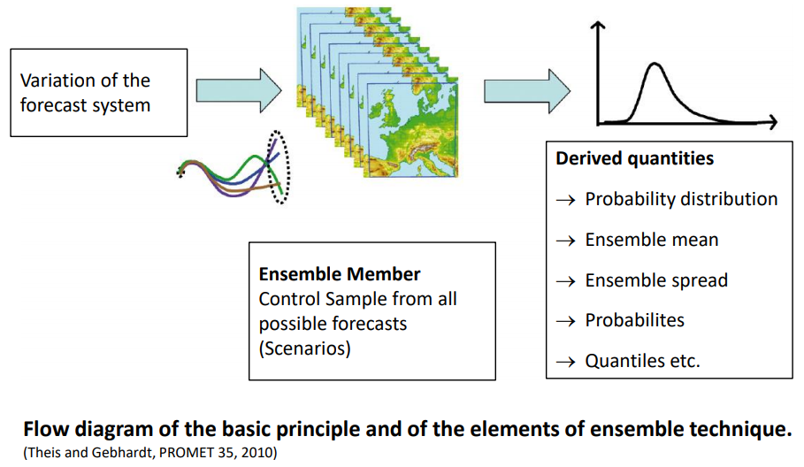 Long-range: > 10 days, further outlook; Comparison of cumulative precipitation forecast of one simulation for different models \(\rightarrow\) measure of uncertainty