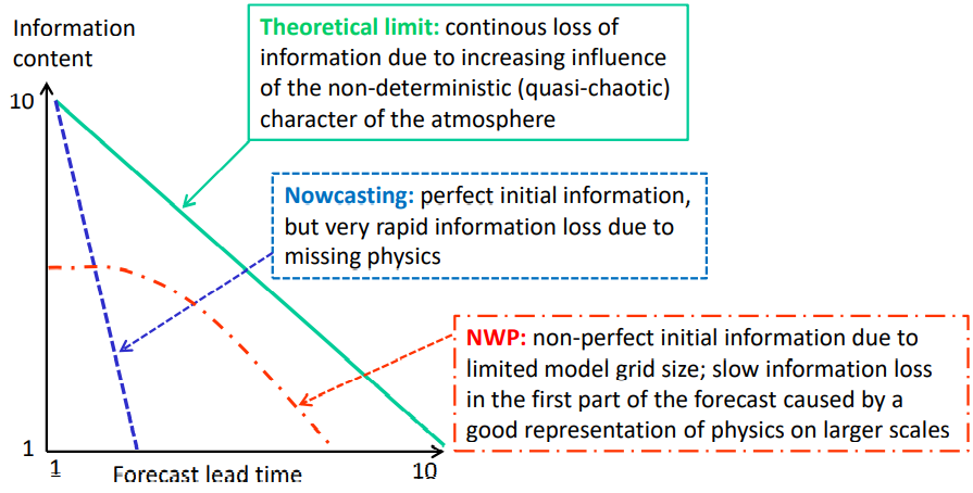 Nowcasting: Next two hours, onlky use of observations (e.g., tracking algorithms for echoes in radar images), without representation of atmospheric physics, e.g., assumption of persistence