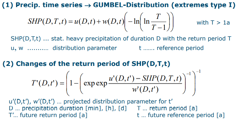 - Adaptation of theoretical distribution of extremes (Gumbel) to the measured precipitation series by regession