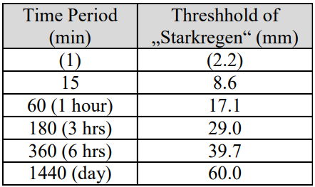 High intensity (Starkregen > 17 mm/h, Wolkenbruch > 60 mm/h), short duration (> 6 h), small scale \(\rightarrow\) flash floods