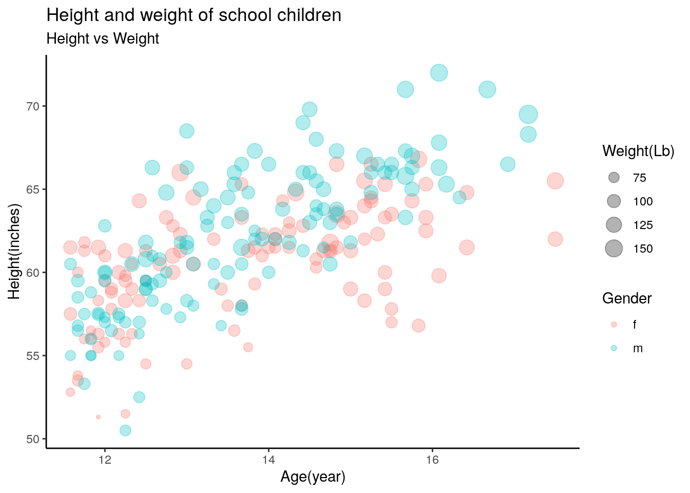p+labs(title="Height and weight of school children",subtitle="Height vs Weight",x="Age(year)",y="Height(inches)",size="Weight(Lb)",color="Gender")+guides(size=guide_legend(order=1),color=guide_legend(order=2))+theme_classic()