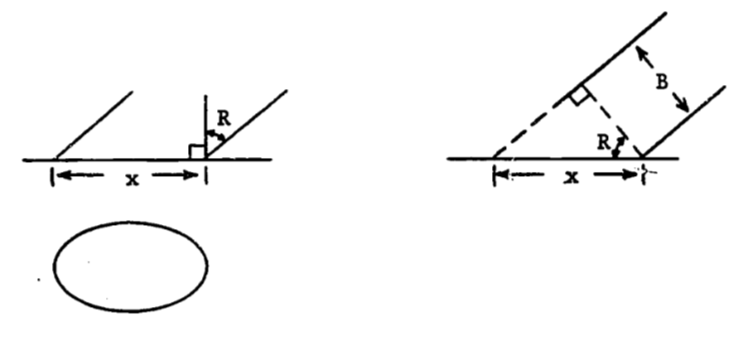 From the right-hand diagram, we have \[\cos R = B/x\] and thus \[x=B/\cos R\] The minor axis is then the circle’s diameter, \(B\). In the answer to part “a”, we replace \(2a\) by \(B/\cos R\) and \(2b\) by \(B\).