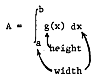 Thus \(\int^b_a dx\) represents the width and \(g(x)\) is the height. Thus the definite a integral as area has intuitive meaning: area = height \(\times\) width. In general, the same visual identification applies: