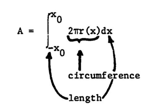 | Surface area | \(2\pi r^2 l\) | \(\int^l_0 2\pi f(y)dy\) |