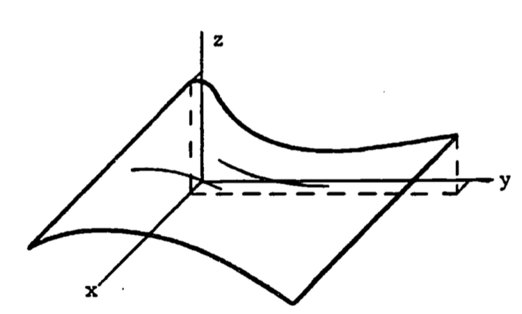 When the surface is more irregular and is not axially symmetric, its area can still be found. The surface must now, however, be described by a three dimensional function which gives the height as a function of the length and width coordinate: \(z = f(x,y)\).
