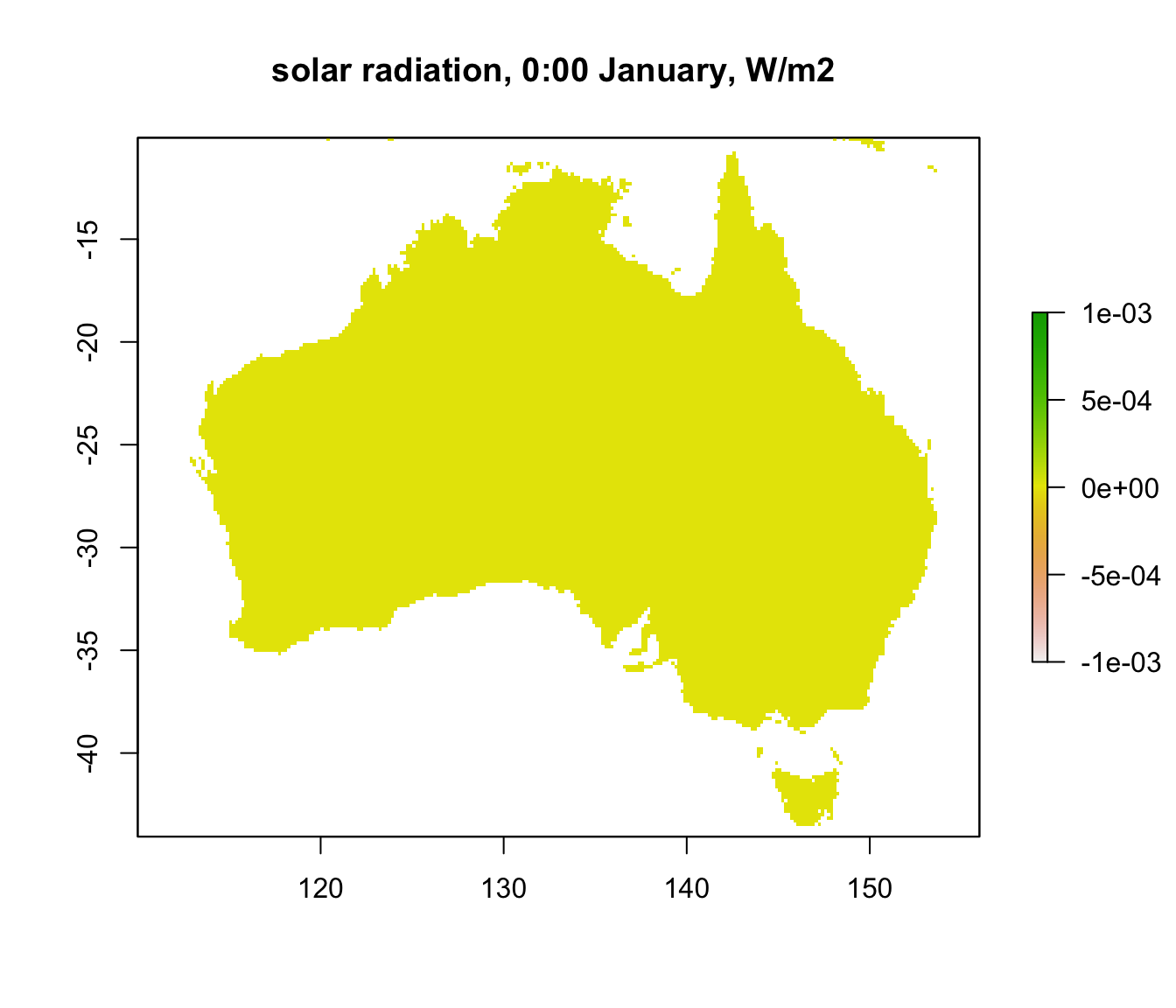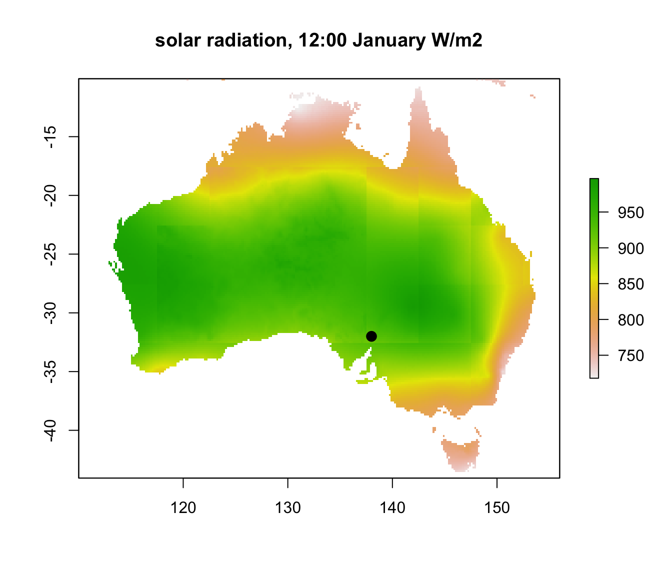 Now we can see a wide range of values, from near 1000 \(W\:m^{-2}\) in central Australia down to just over 700 in the far north and south of the country. You can clearly see the effect of cloud cover during the wet season in the ‘Top End’ of Australia.