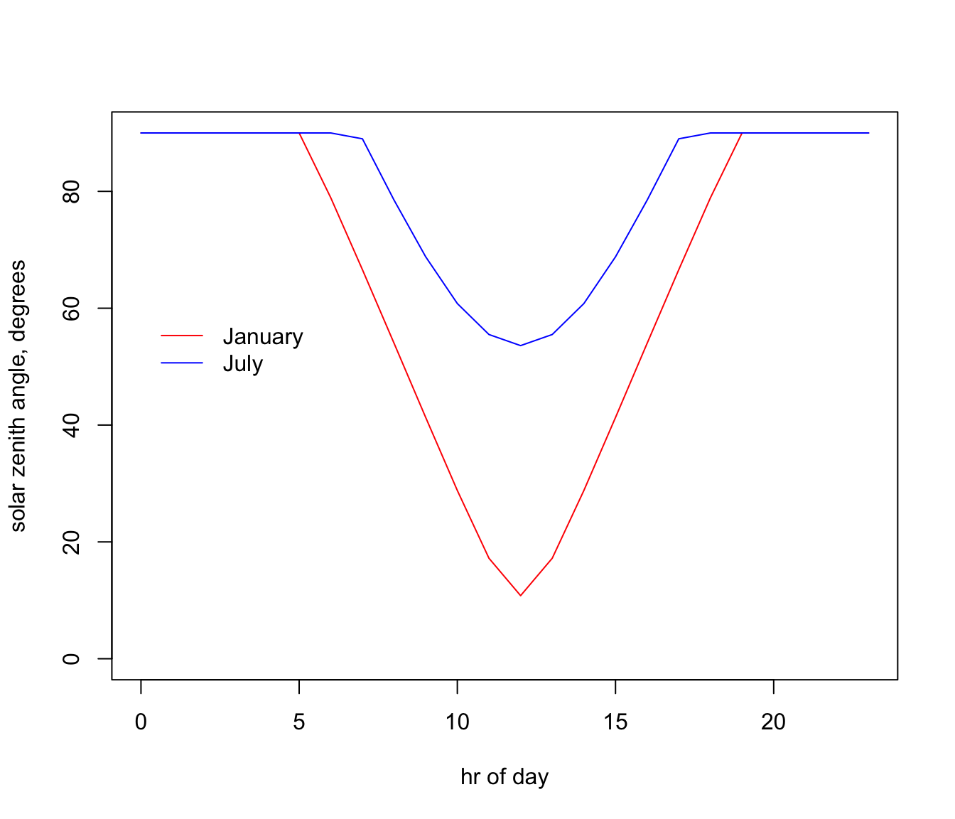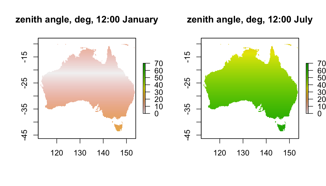 The code chunk below reads in and plots the zenith angles for midday for summer and winter in Australia.