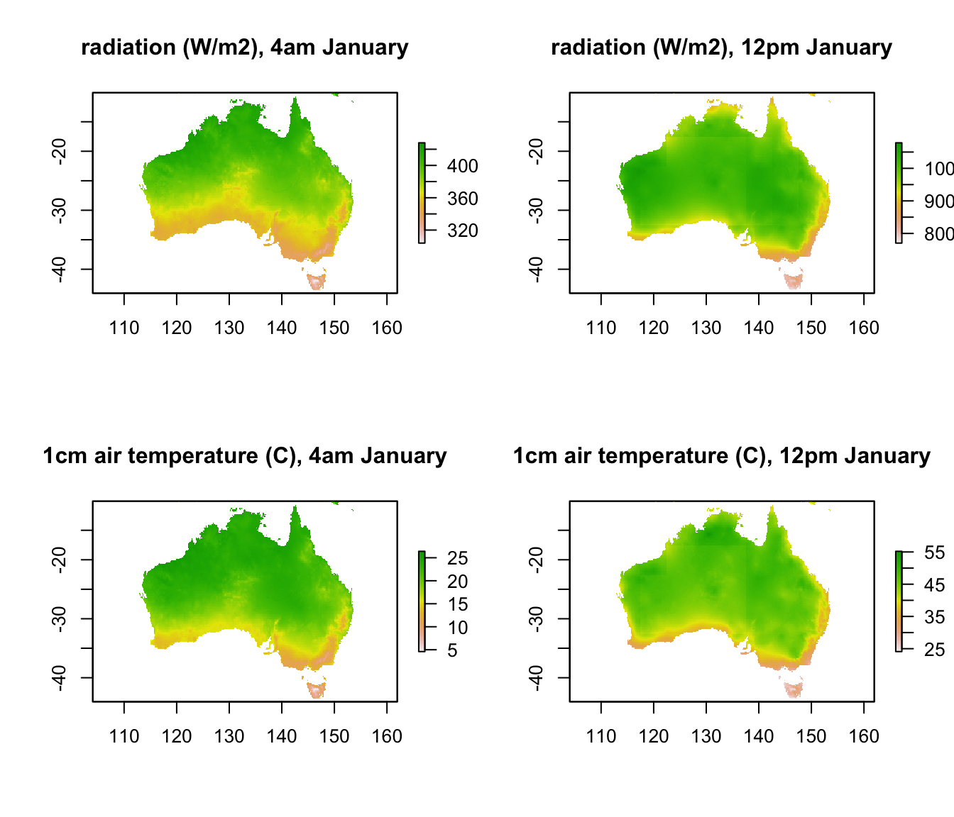 D0cm_jul_Aust<-brick(paste0(path,"substrate_temperature_degC/soil/0_shade/D0cm_soil_0_7.nc")) Now, let’s modify the Qbound function to make it work with the grids, giving it the name Qbound_micro. Have a close look at how this differs from Qbound. Note that since we now have total solar radiation (direct plus diffuse) as an input, we need to repartition it into direct and diffuse using the parameter ‘pctdiff’ (with the value used in the original calculations for microclim, which was 15%). Air temperature is no longer an input - why? What has replaced it? Note also that we also have only one output, ‘Q_rad’, because we are making these calculations for each hour of the day so it could be for day or night.