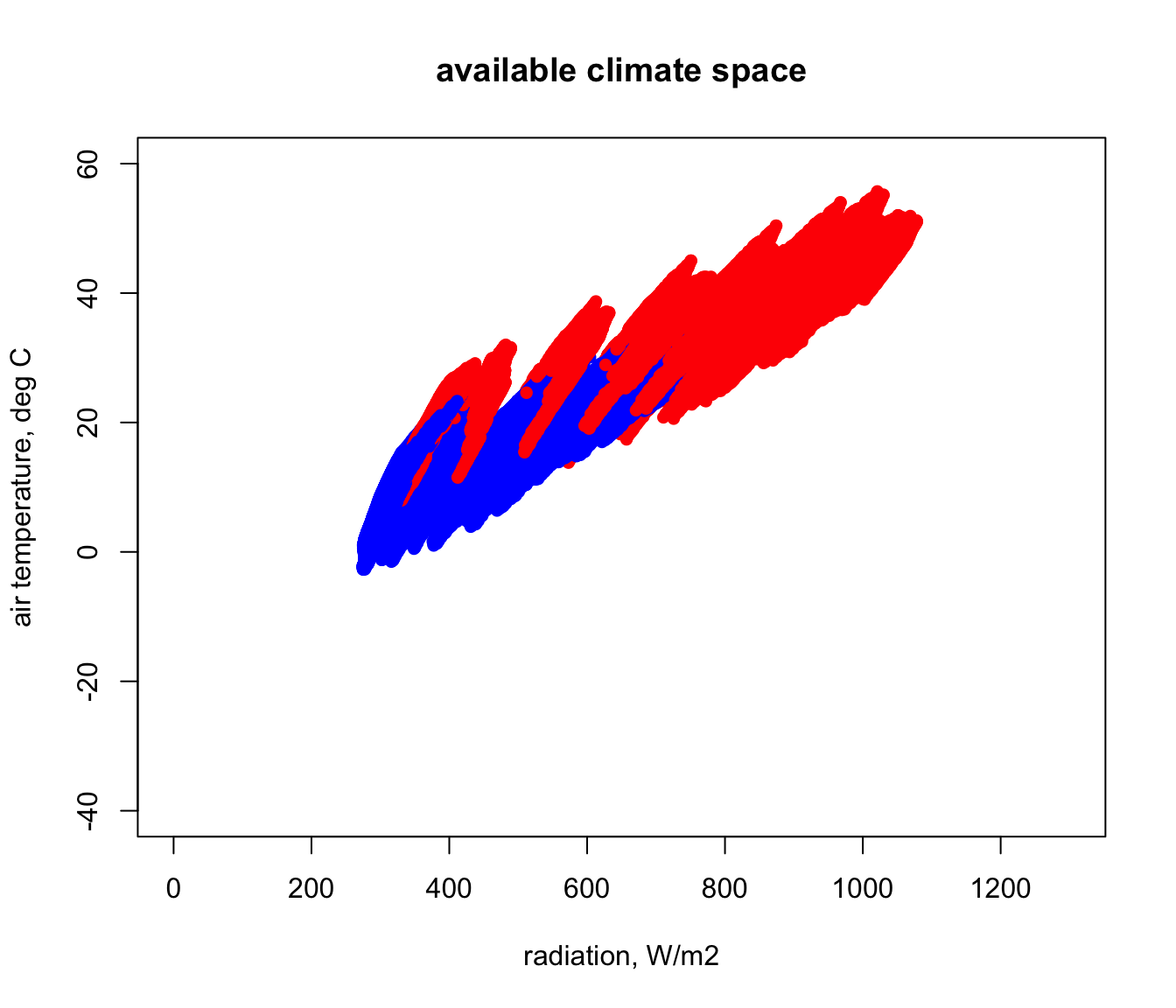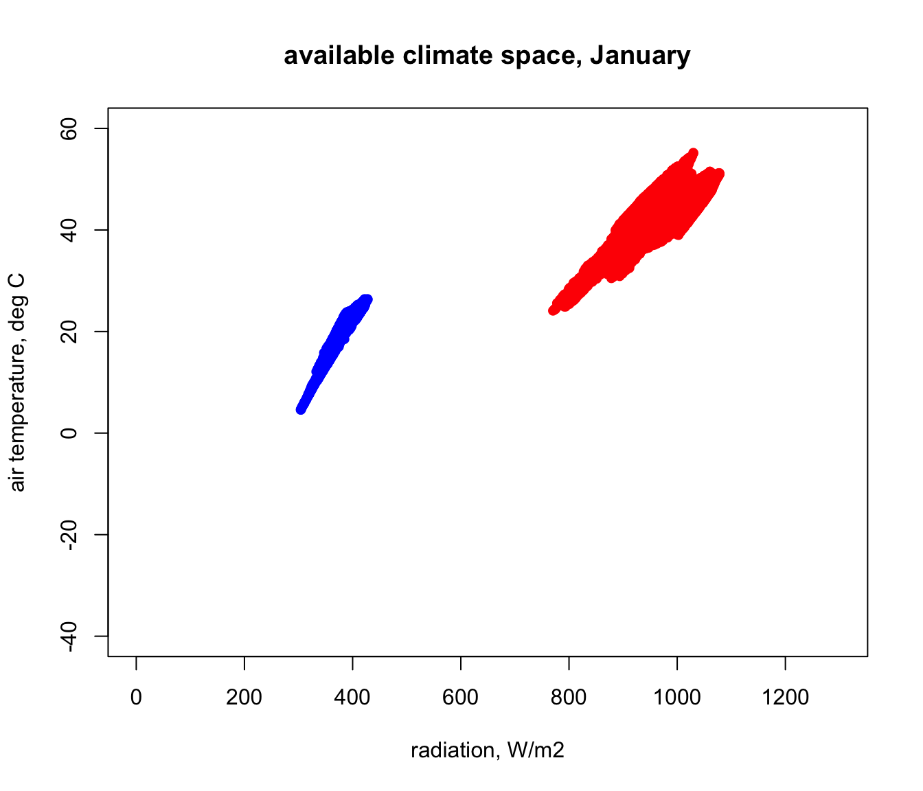 xlab = 'radiation, W/m2', ylab = 'air temperature, deg C', main = "available climate space")