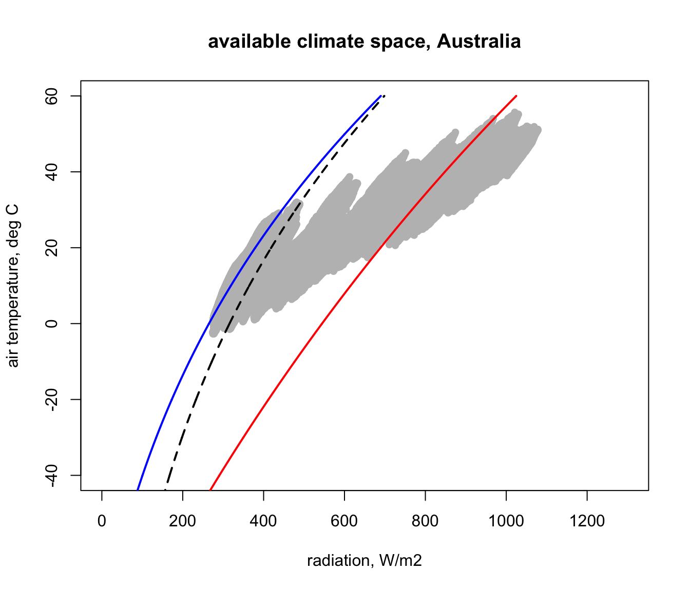 Now that we have the microclim data, however, we can make a much better estimate of the bounding radiation and air temperature combinations available on earth at different times of year and at different times of day. We will do this first for Australia.
