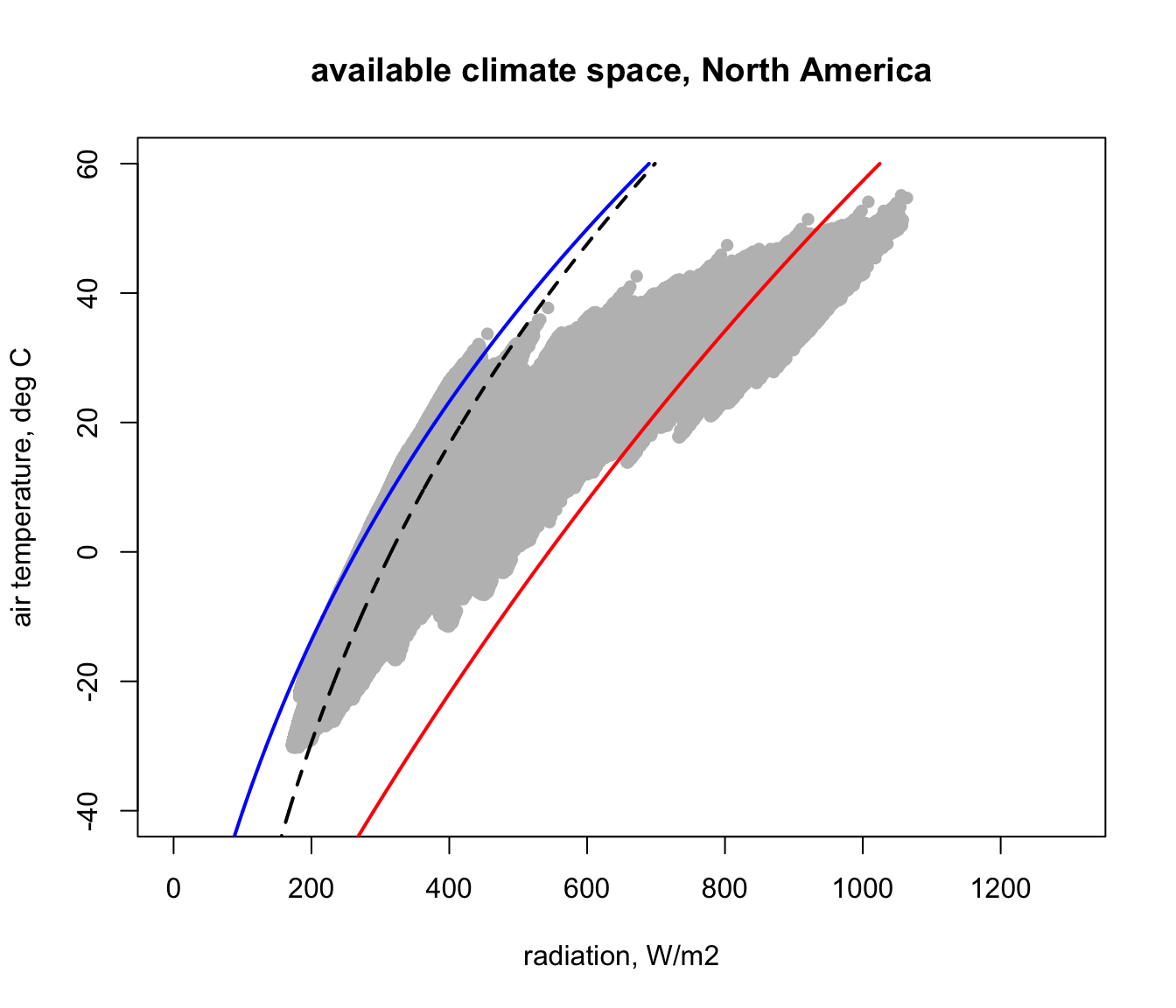 In module 9 you recreated Figure 12 of Porter and Gates (1969) which shows the bounding combinations of radiation (solar plus infra-red) and air temperature available on earth. Recall that this was an approximation that assumed, unrealistically, that the ground temperature was equal to air temperature when computing the clear night sky bounding curve. It also attempted to capture the fact that sun angles are typically lower in the places with very low air temperatures (except for high tropical mountains), but only very roughly by assuming the zenith angle declined linearly with latitude.