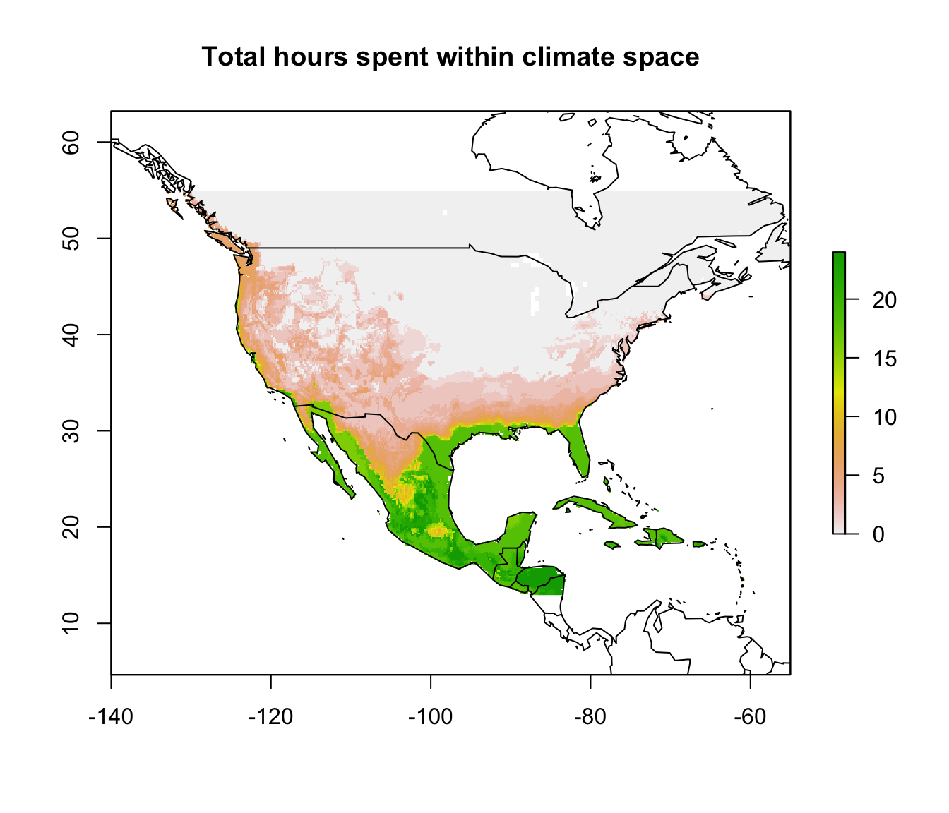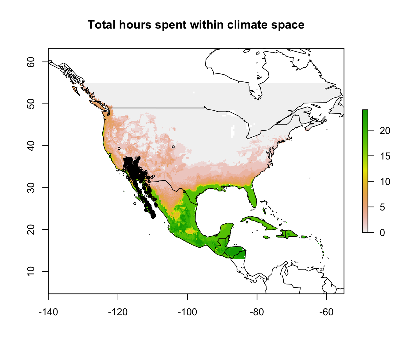 Now we’ll sum the final raster brick to get the total number of hours the Desert Iguana would spend inside its climate space in open habitat and then add the distribution points to this map.