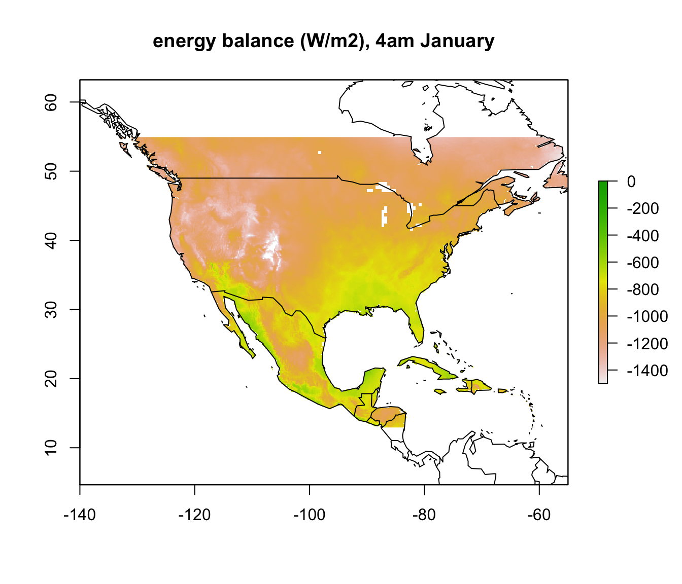 plot(enbal_hot[[5]], main = "energy balance (W/m2), 4am January", zlim = c(-1500,0))