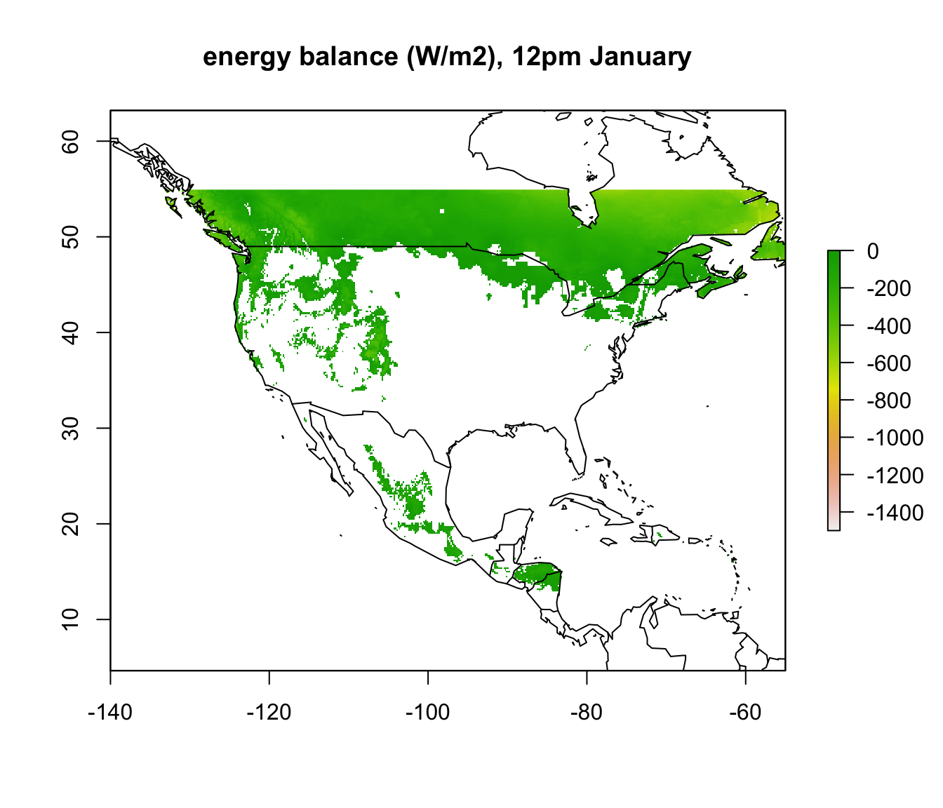 plot(enbal_hot[[13]], main = "energy balance (W/m2), 12pm January", zlim = c(-1500,0))