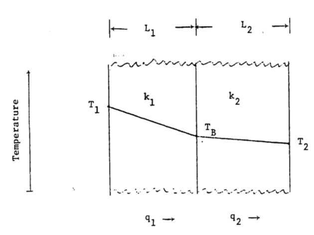 5a. In the diagram, heat flows through two materials from the left boundary (temperature \(T_1\)) to the right boundary (temperature \(T_2\)). Assure steady state conditions.