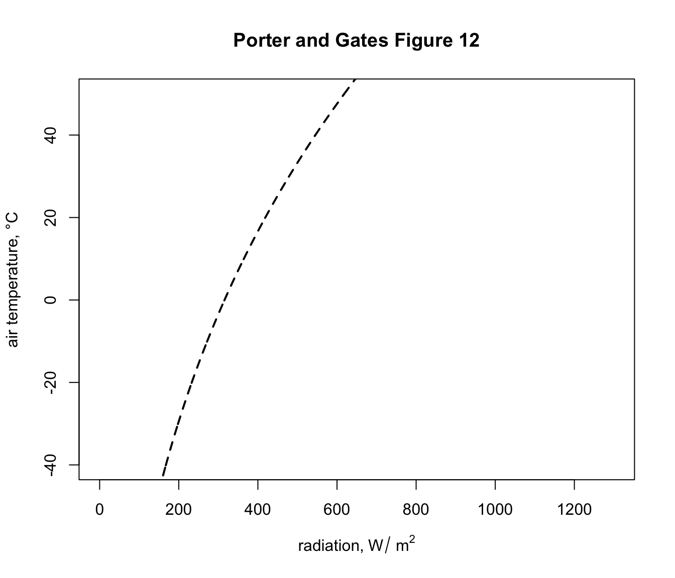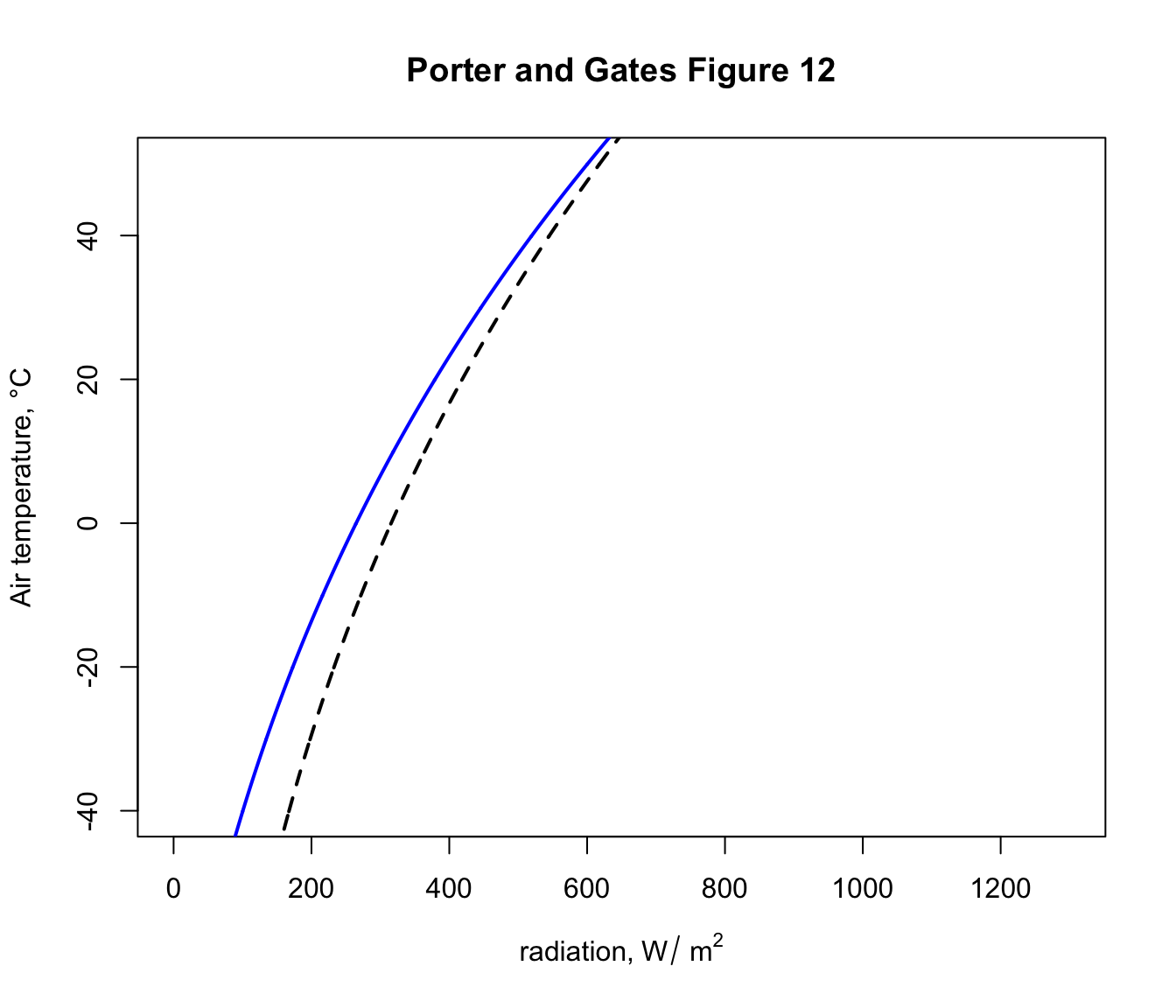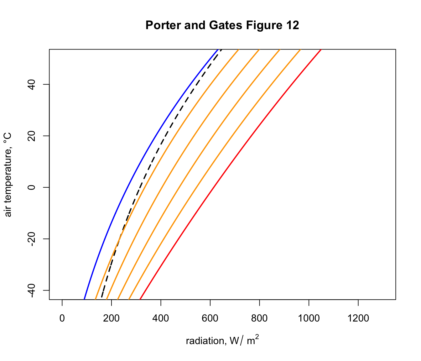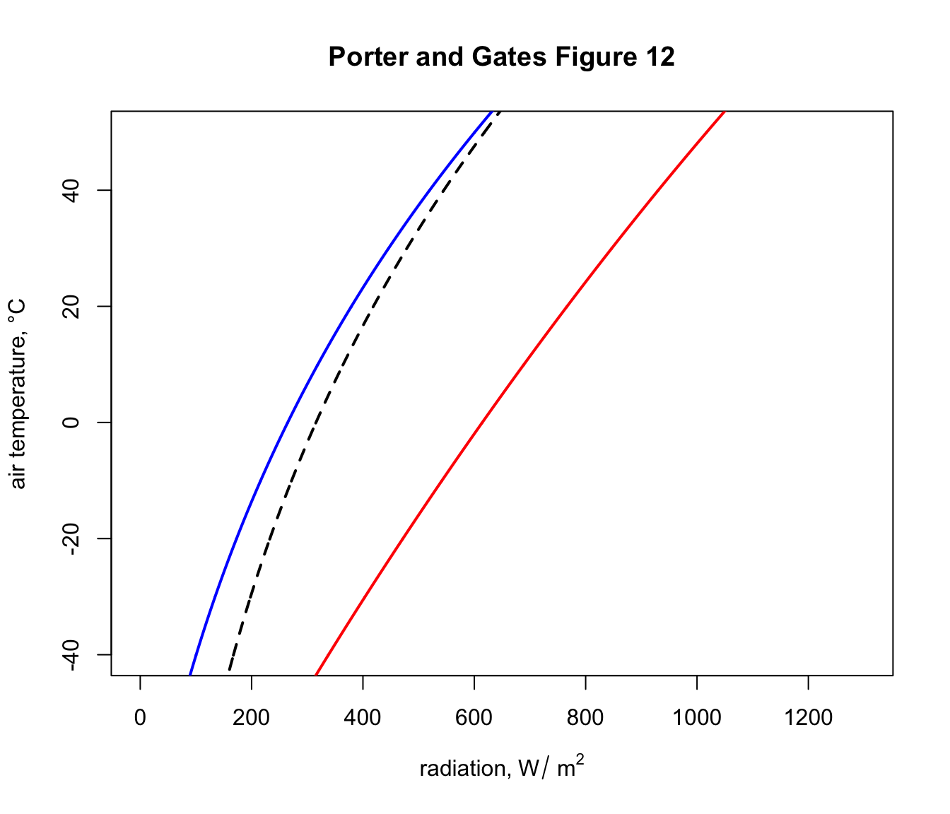 Now that we have defined the equation for computing bounding values of radiation to go with air temperature under different scenarios, we are ready to make a figure showing these boundary conditions. The figure will be similar to Figure 12 of Porter an Gates (1969) but will be in SI units with a slightly different line for clear night sky conditions (due to the apparent error in Porter and Gates discussed above).