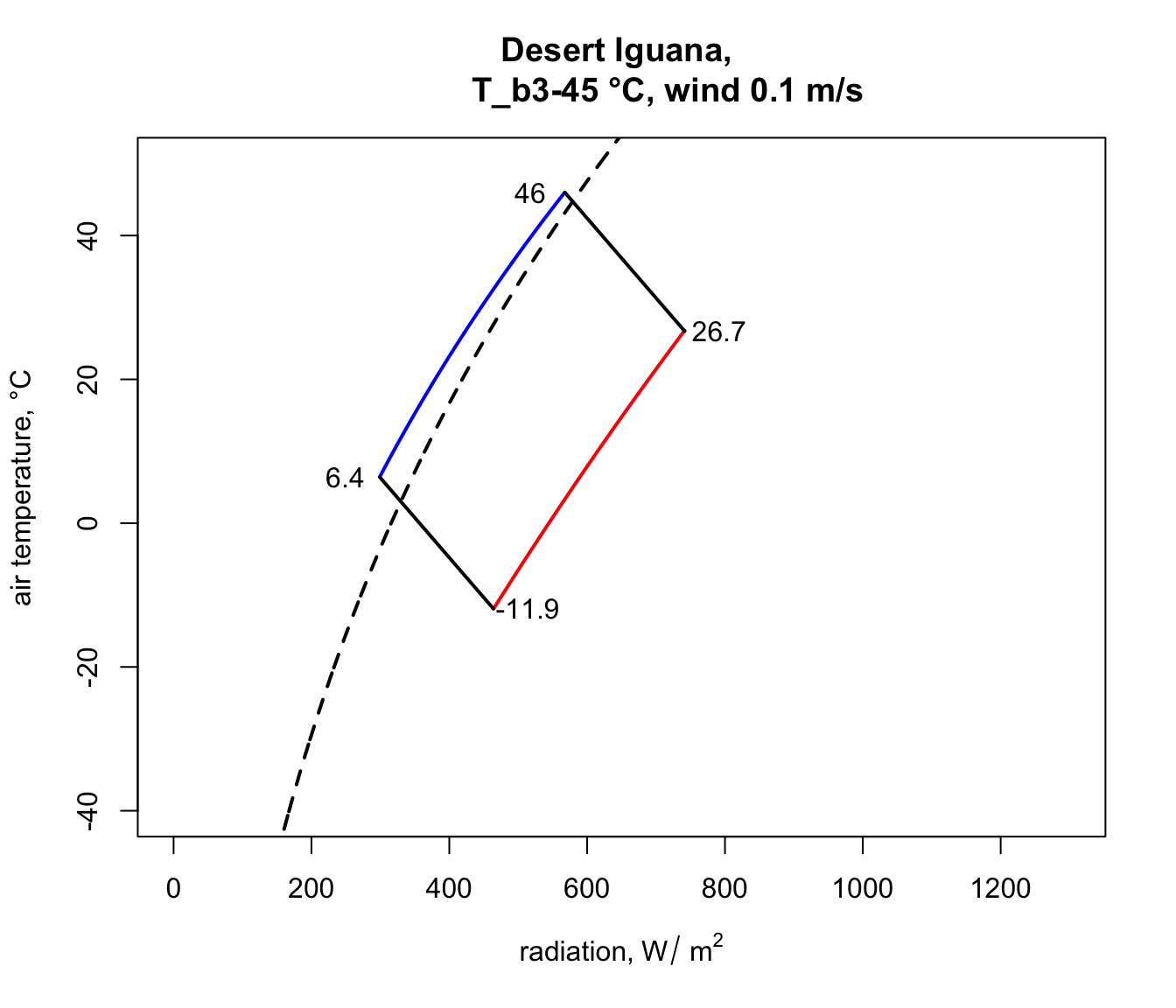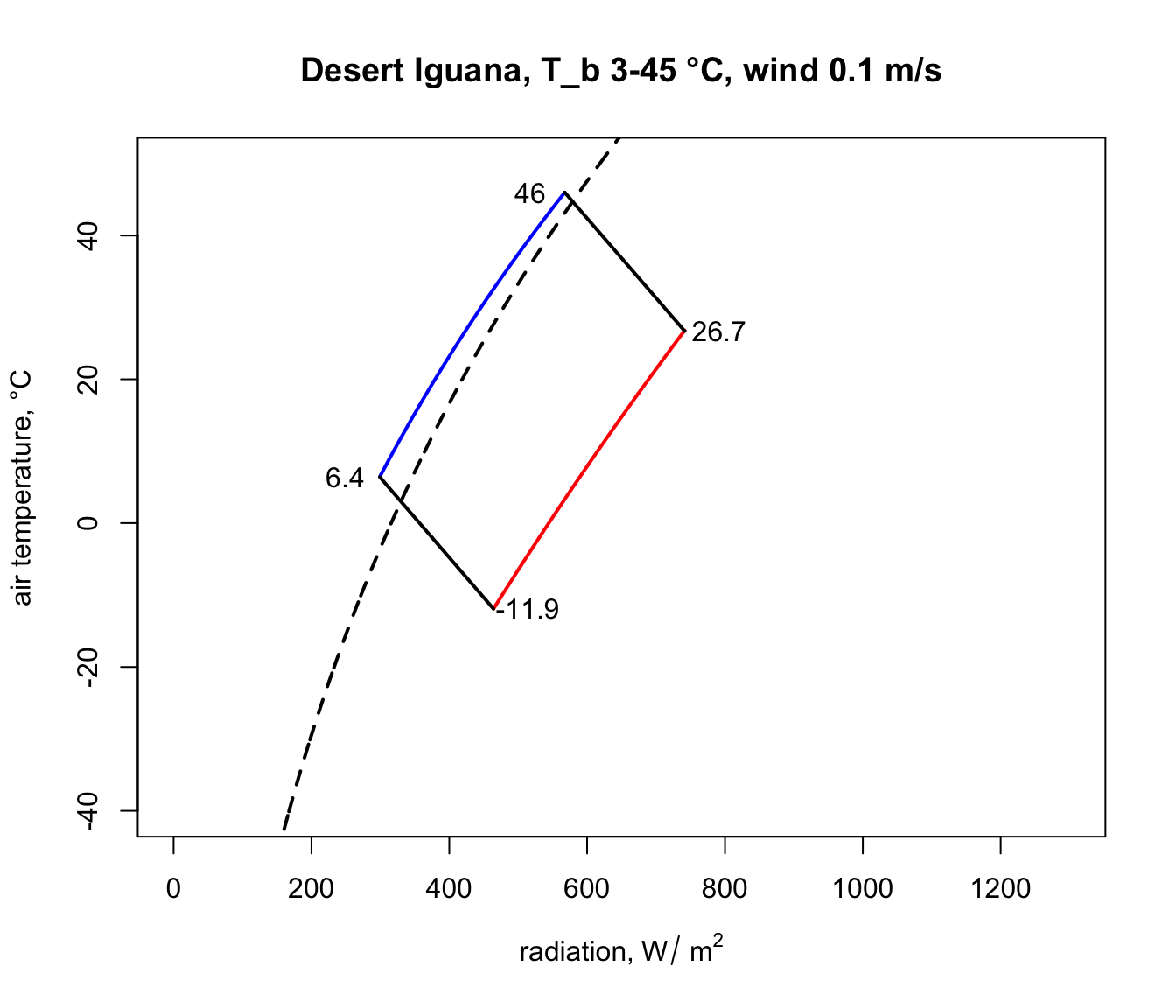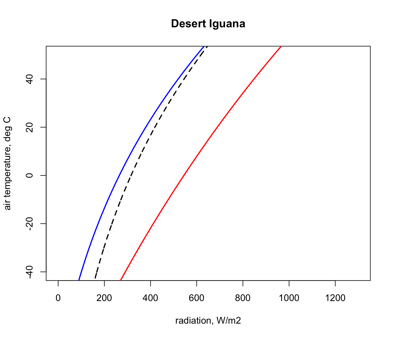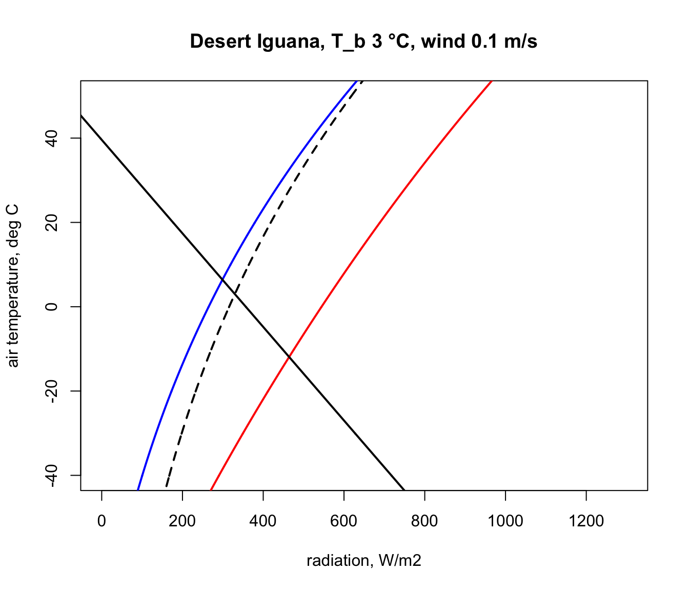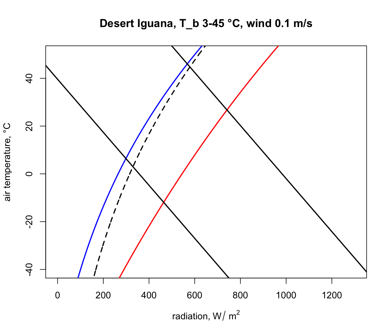 Q_sky <- climspace$Q_skyNow we can plot the results, first plotting the blackbody relationship as a dotted curve. This is the radiation load on an object in a cave or room or deep shade, where the wall/foliage temperature is equal to the air temperature.