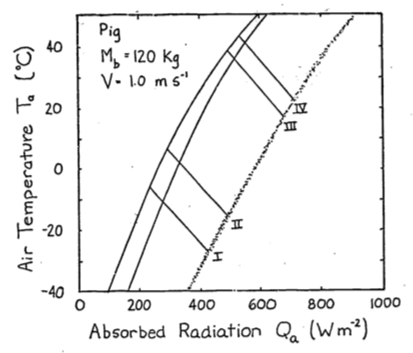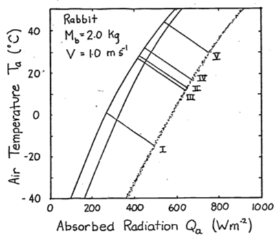 The energy balance is \[Q_a + M = \varepsilon\omega T_r^4 + E_{sw} + E_{ex} + h_c(T_r - T_a) + k(T_r - T_g)\] If \(T_r > T_g\), \(G\) is positive and the animal will receive more energy. This will shift the climate space to the right. If \(T_g > T_r\), the opposite shift will occur.